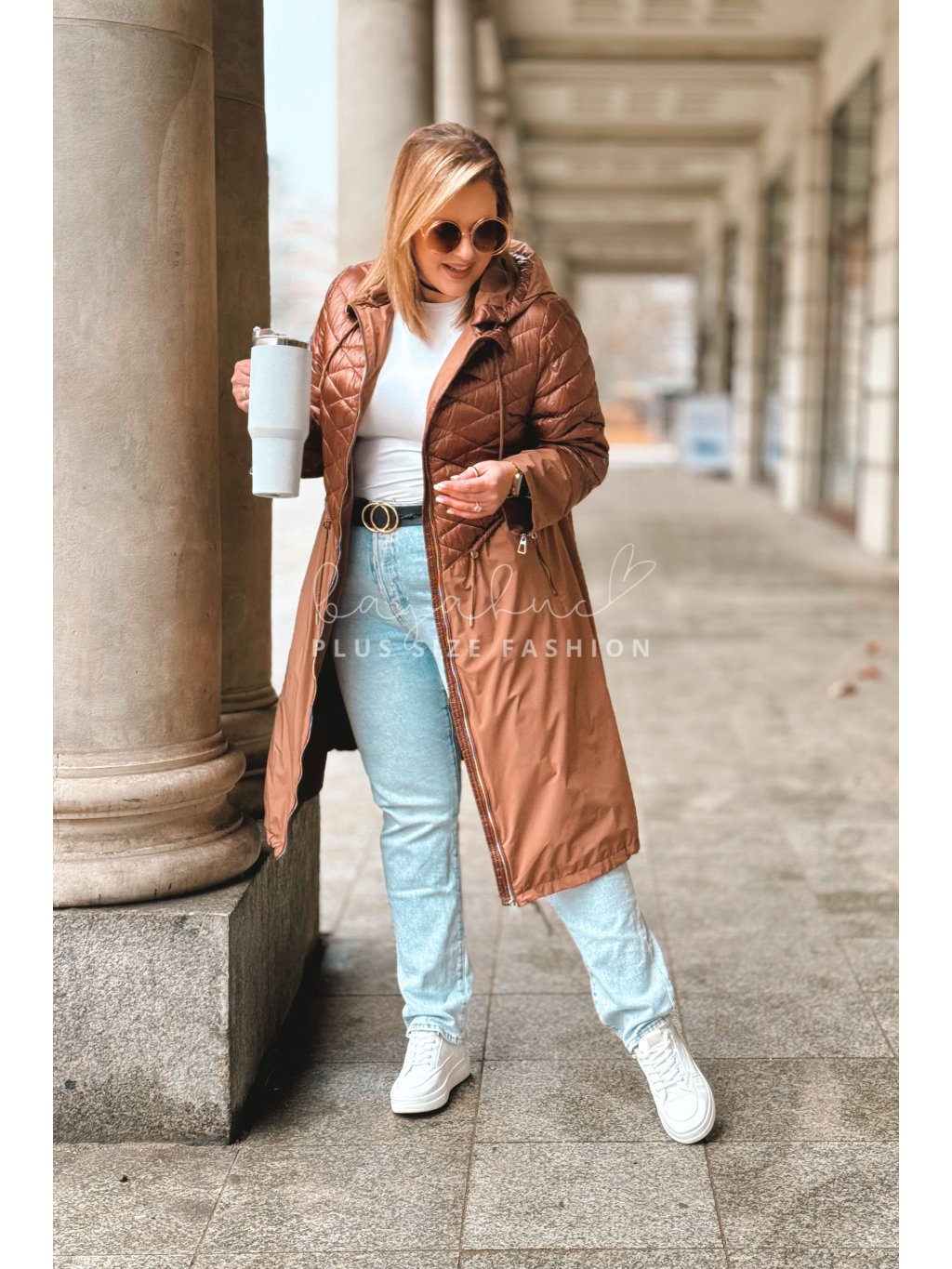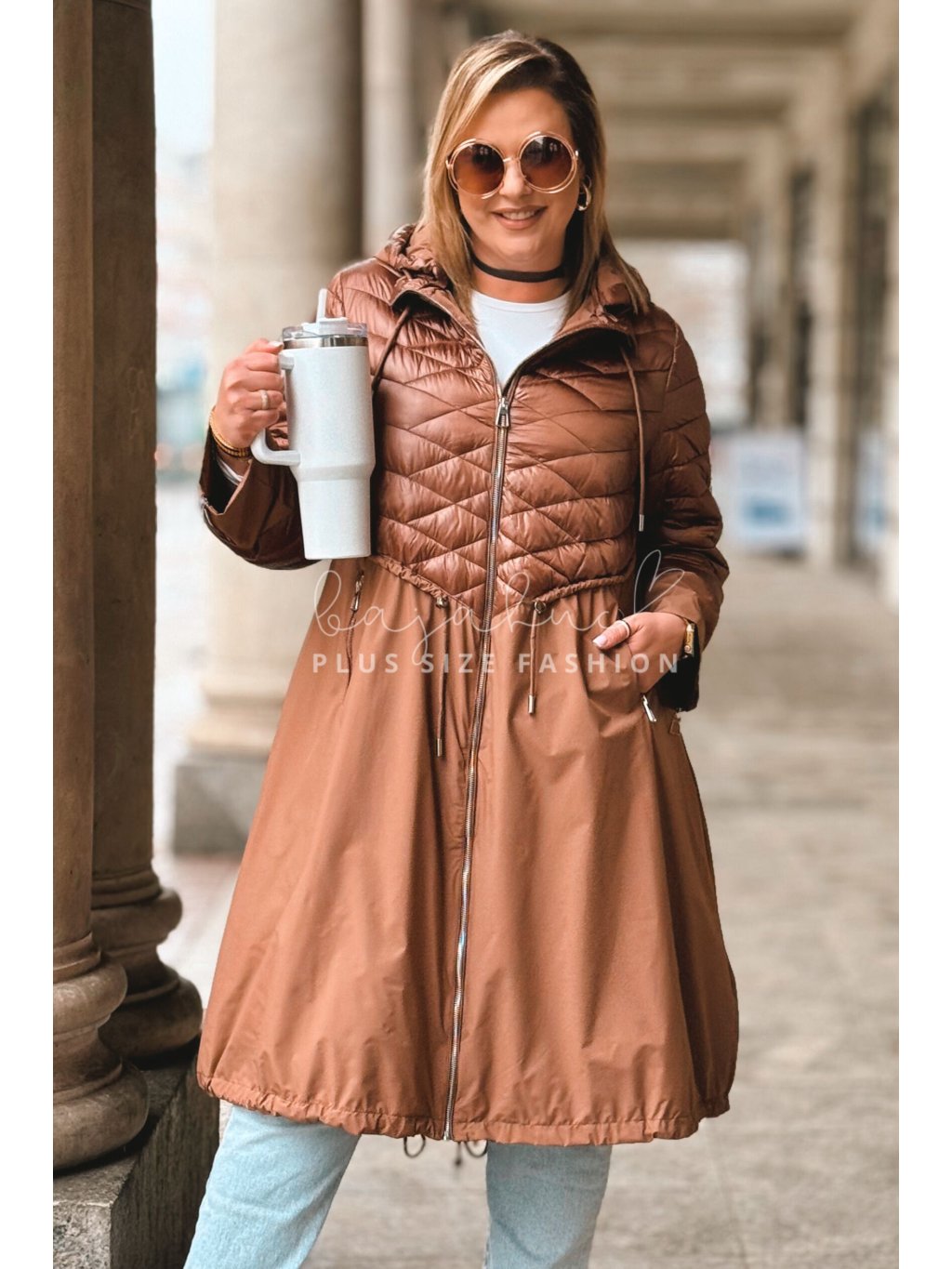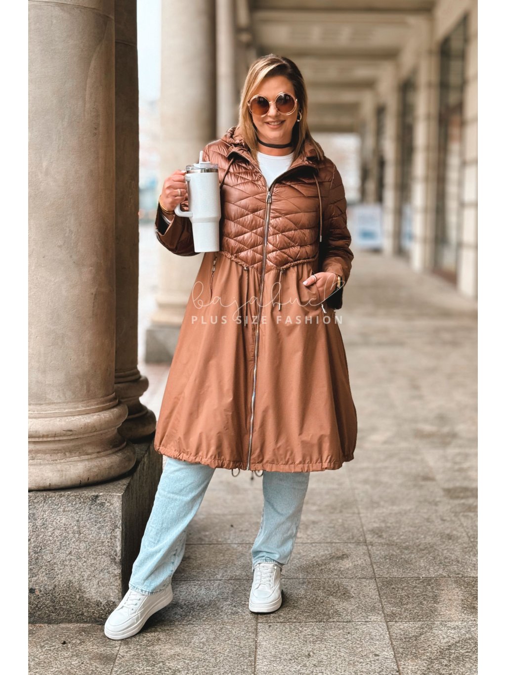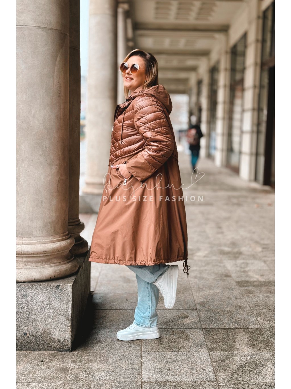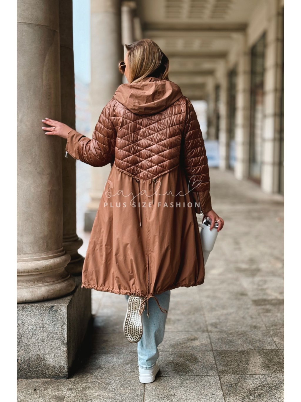 Predĺžená prechodná bunda pre moletky VELANA, je jedinečný model plus size bundy a svojim výnimočným prevedením na prvý pohľad zaujme. Plus size bunda VELANA má kapucňu, čo oceníte v prechodnom či sychravom počasí. Vrecká po bokoch sa zapínajú na zips a poslúžia vám na odloženie drobností. V páse má bunda šnúrku na stiahnutie, vďaka ktorej sa prispôsobí postave a pomáha ju pekne tvarovať. Naspodu bundy je taktiež šnúrka, a vzadu je krátky rozparok. Rukávy sú na konci oživené zipsami. Prešívaný vrchný diel, á-čkový strih, prepracovanosť a detaily dodávajú bunde čaro a šmrnc.