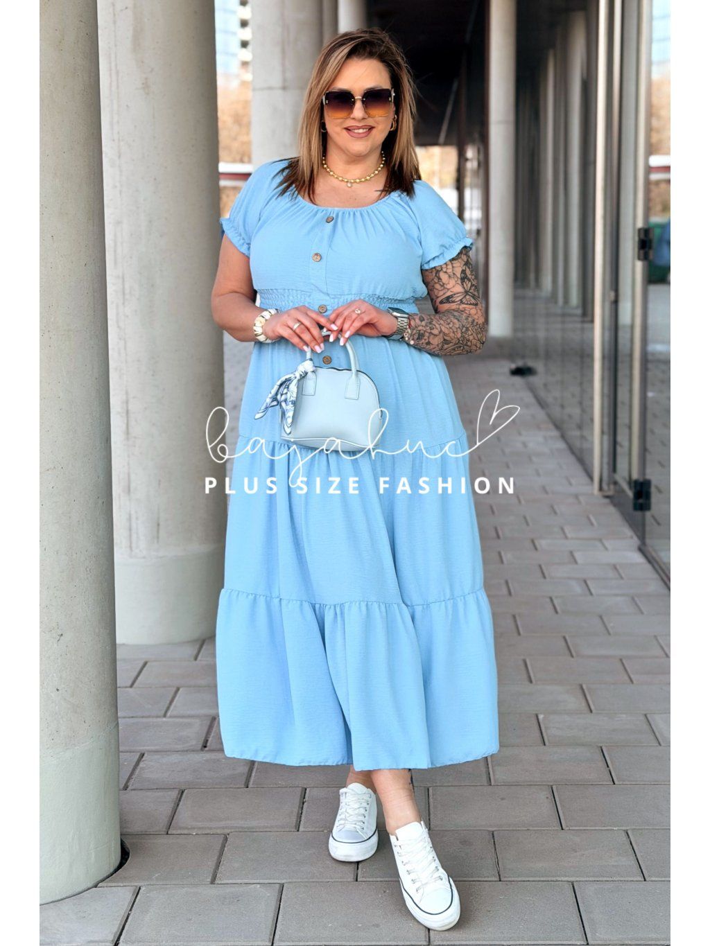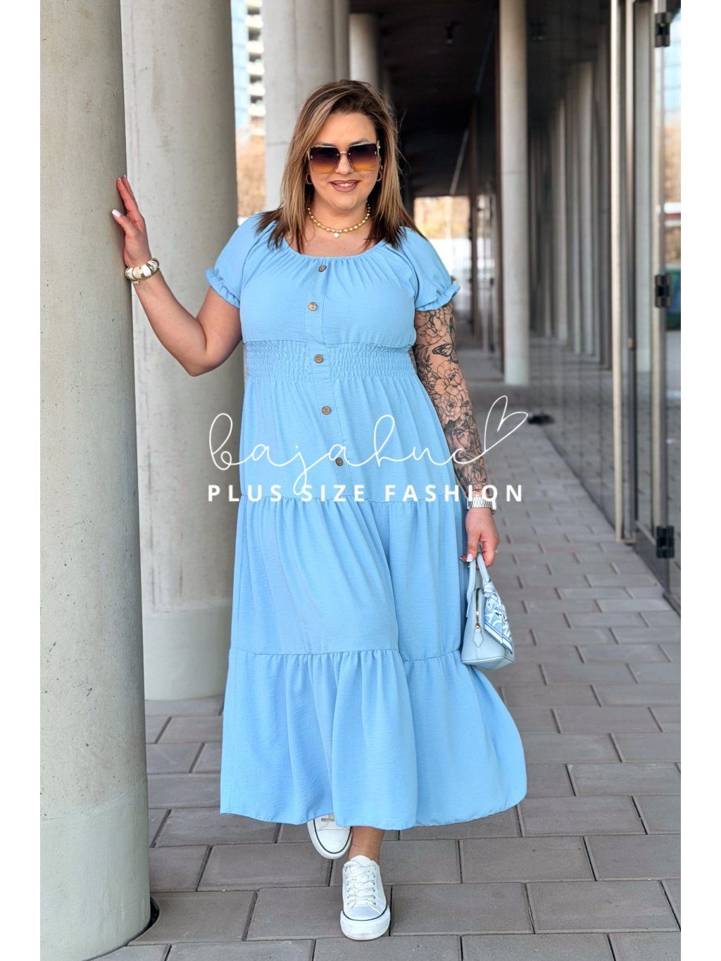 Pohodlné dámske maxi šaty pre moletky DILENA sú model, ktorý je ako stvorený pre ženy, ktoré majú radi voľnosť pri pohybe, oceňujú ľahkosť a predovšetkým ženskosť. Plus size šaty DILENA majú krátke rukávy ukončené jemnou gumičkou s malým volánikom. Model je vpredu oživený radom malých gombíkov. Pás vám zvýrazní jemné riasenie s elastickou gumičkou. Rozšírená prešívaná sukňa dodáva celku dievčenský vzhľad a nádych voľnosti. Šaty vďaka svojmu strihu skvelo sedia na postave a zakryjú jej nedokonalosti.