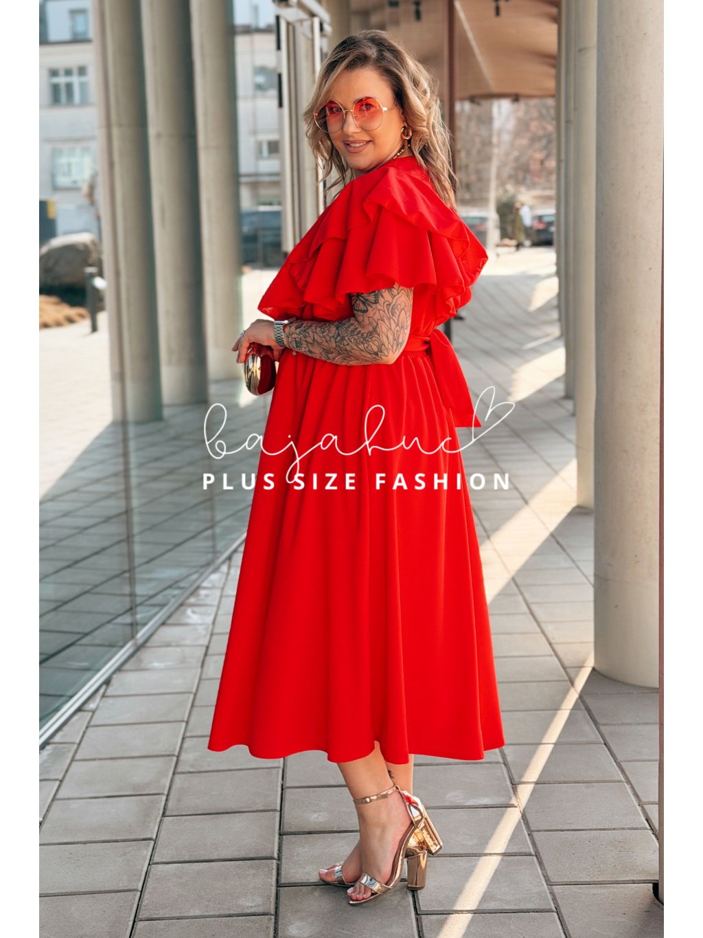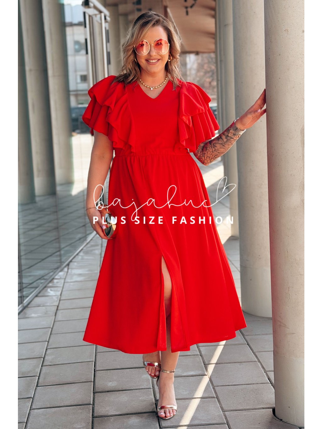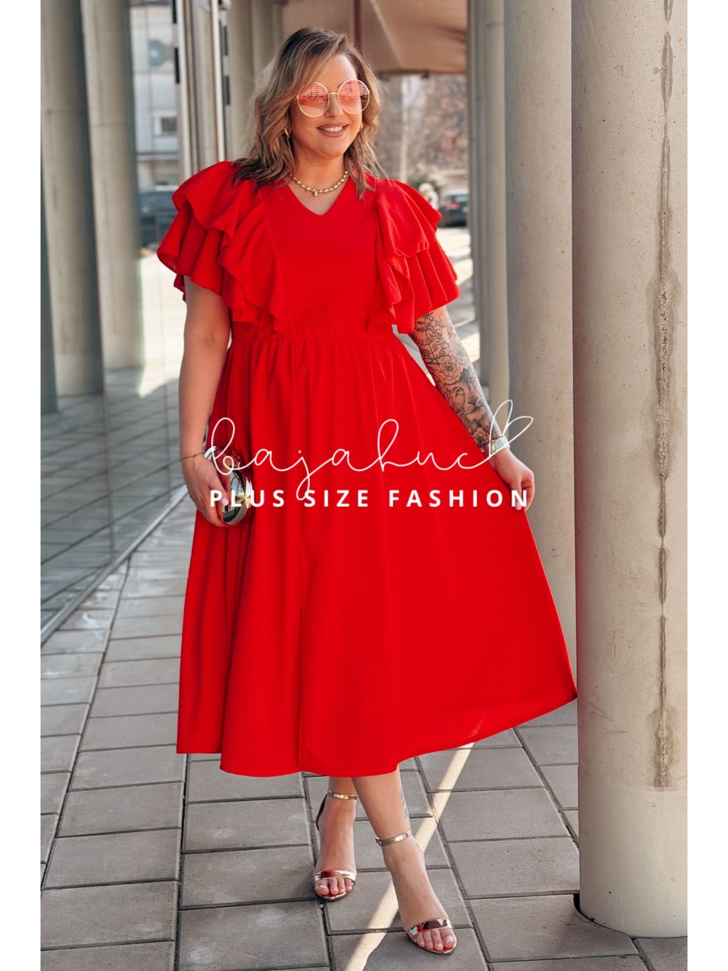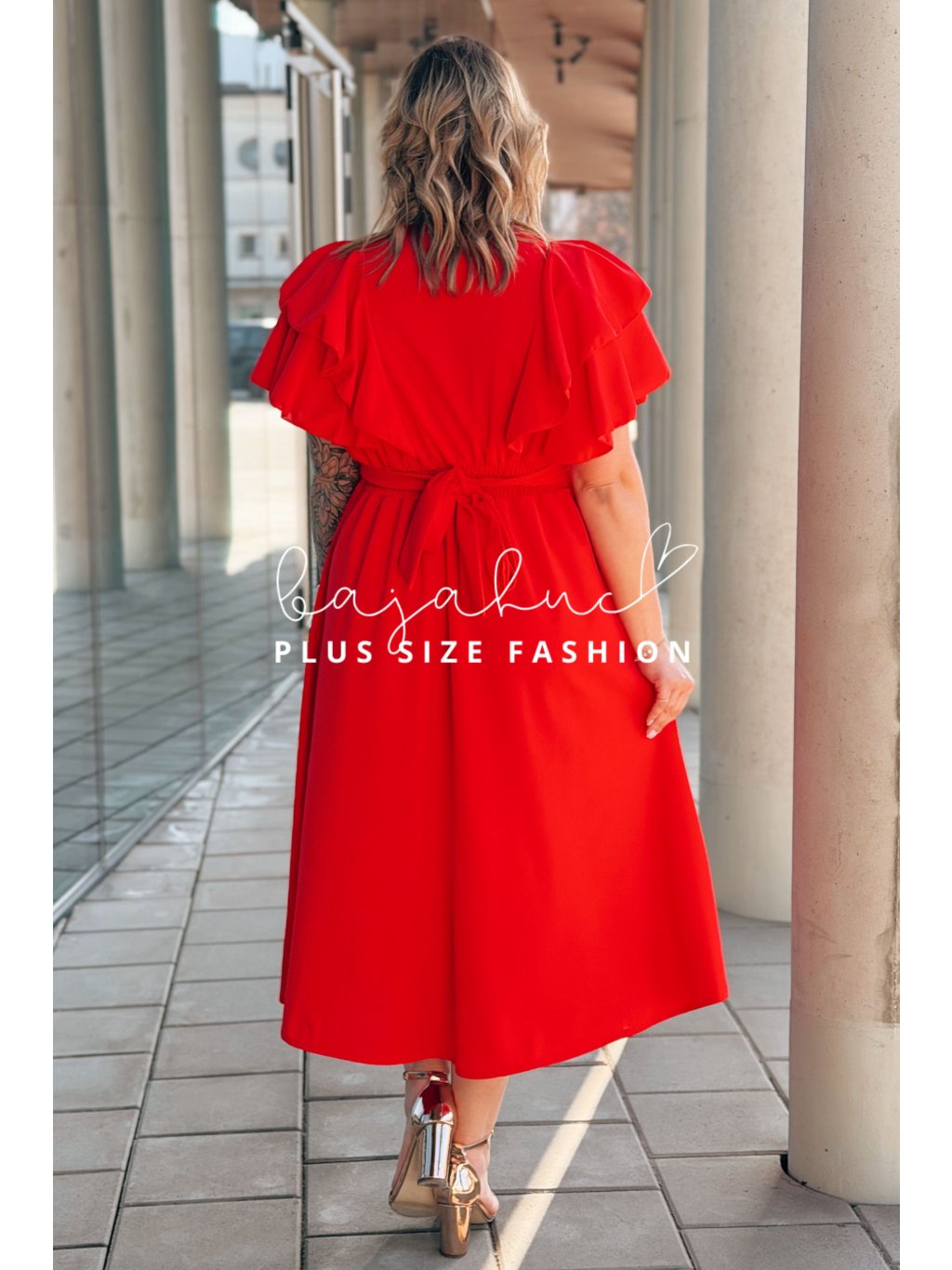 Dámske midi šaty s volánovými rukávmi pre moletky Aura červené