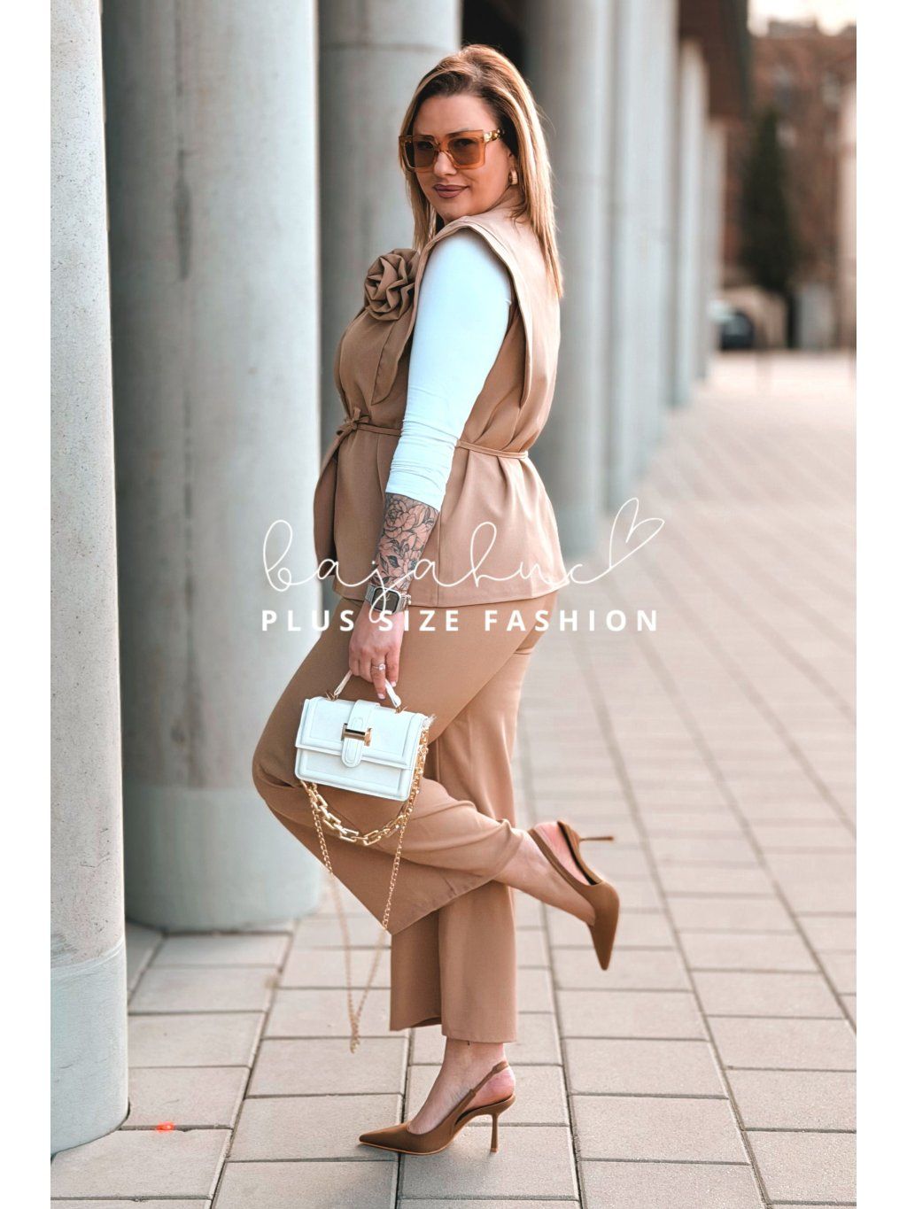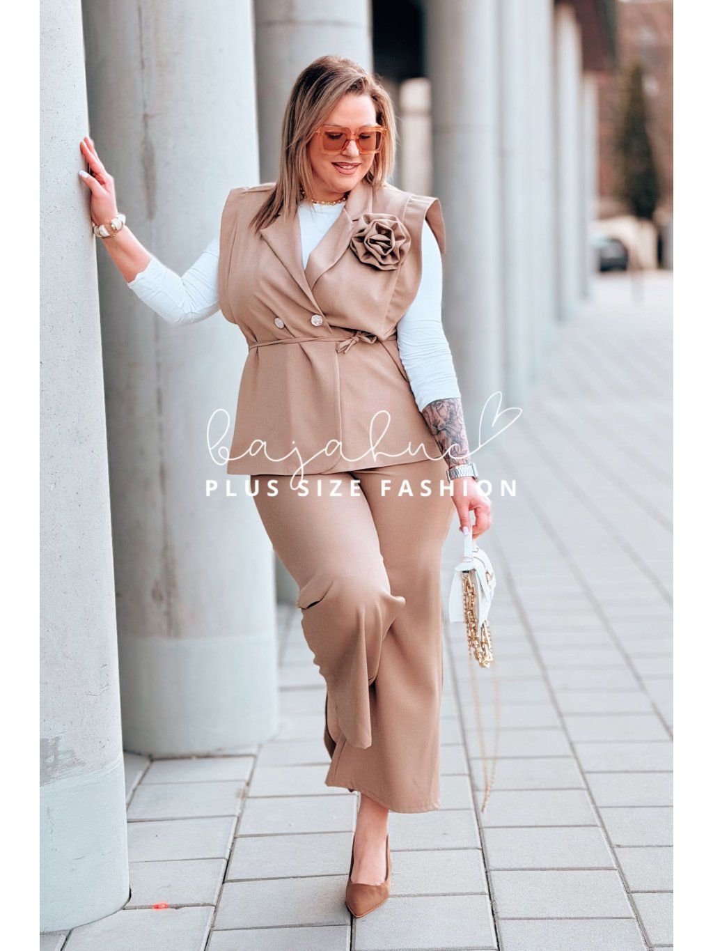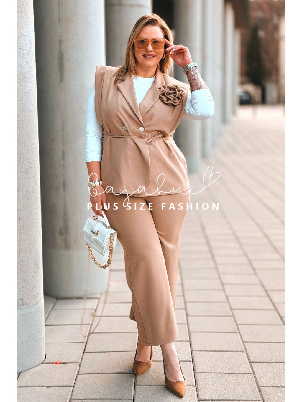 Elegantný dámsky komplet pre moletky IZABEL je určený pre ženy s krivkami, ktoré majú radi eleganciu, štýl a komfort pri nosení. Komplet tvorí vesta a nohavice. Je ušitý z kvalitnej a príjemnej látky, čo zaručí neskutočný komfort pri nosení. Vesta je krátkeho strihu a je podšitá. Je oživená romantickou ružou a elegantnými gombíkmi. Opasok model dopĺňa, pomáha zvýrazniť pás a podčiarknuť ženské krivky. Nohavice majú elastický pás, sú rozšíreného strihu, ktorý opticky predlžuje nohy. Tento model je skvelou voľbou na mnoho príležitostí.