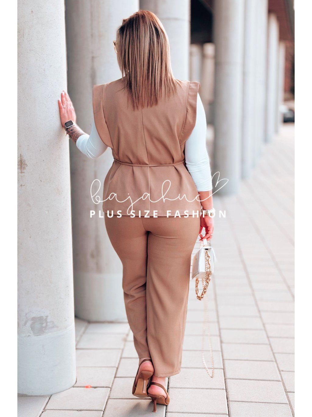 Dámsky elegantný komplet vesty a nohavíc pre moletky Izabel karamelový