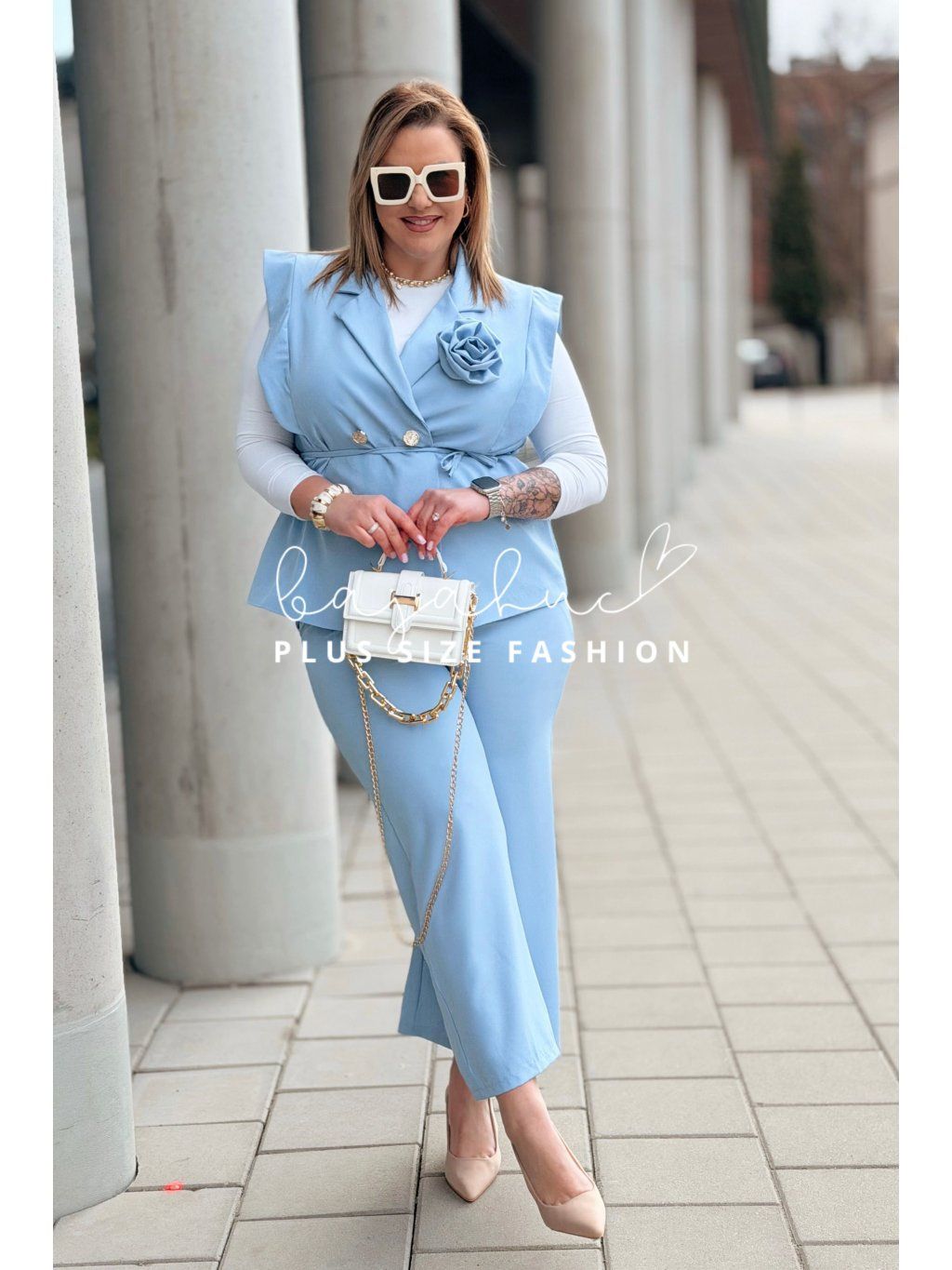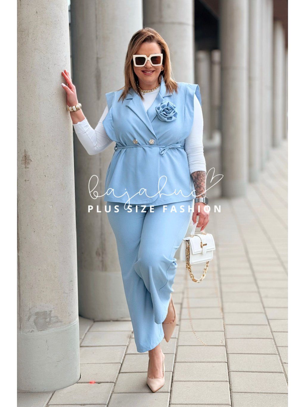 Elegantný dámsky komplet pre moletky IZABEL je určený pre ženy s krivkami, ktoré majú radi eleganciu, štýl a komfort pri nosení. Komplet tvorí vesta a nohavice. Je ušitý z kvalitnej a príjemnej látky, čo zaručí neskutočný komfort pri nosení. Vesta je krátkeho strihu a je podšitá. Je oživená romantickou ružou a elegantnými gombíkmi. Opasok model dopĺňa, pomáha zvýrazniť pás a podčiarknuť ženské krivky. Nohavice majú elastický pás, sú rozšíreného strihu, ktorý opticky predlžuje nohy. Tento model je skvelou voľbou na mnoho príležitostí.