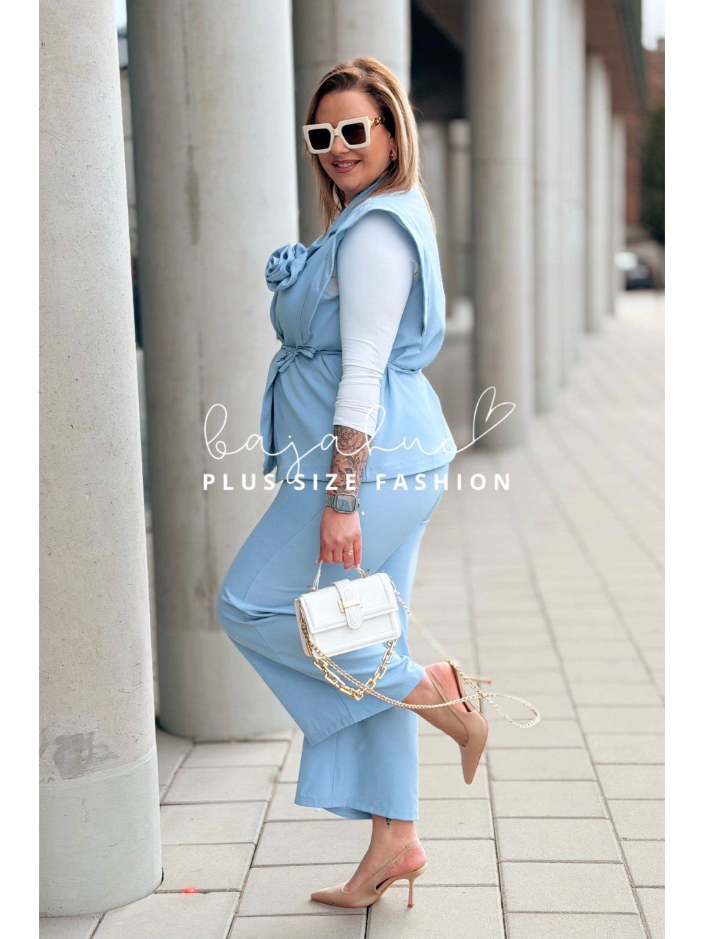 Dámsky elegantný komplet vesty a nohavíc pre moletky Izabel svetlomodrý