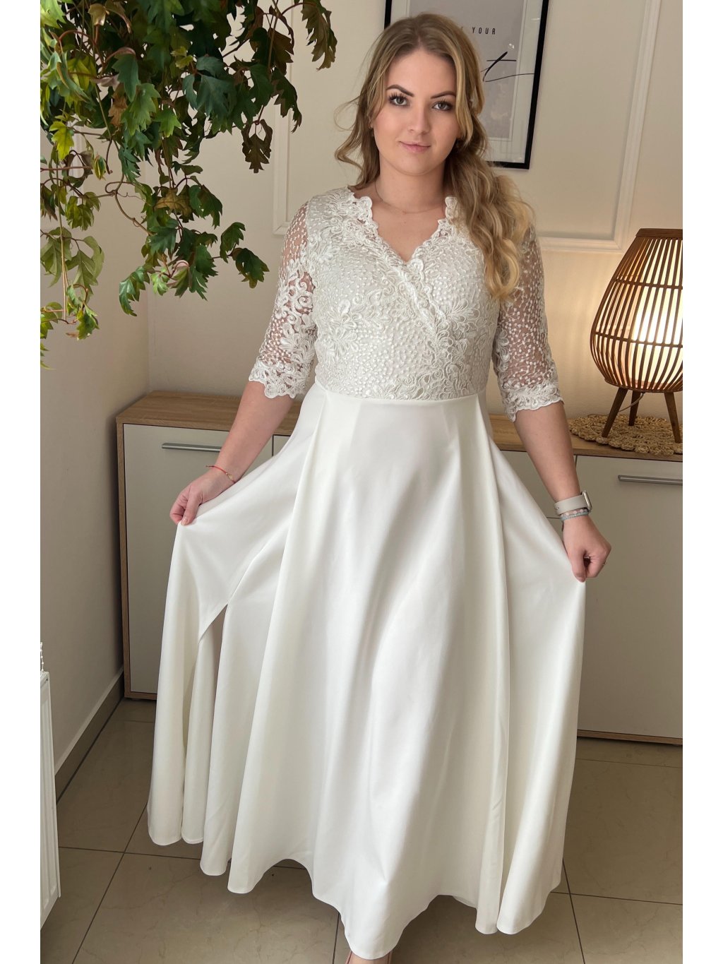 ZĽAVA Dlhé dámske spoločenské šaty pre moletky Roselyn smotanové gipiura čipka