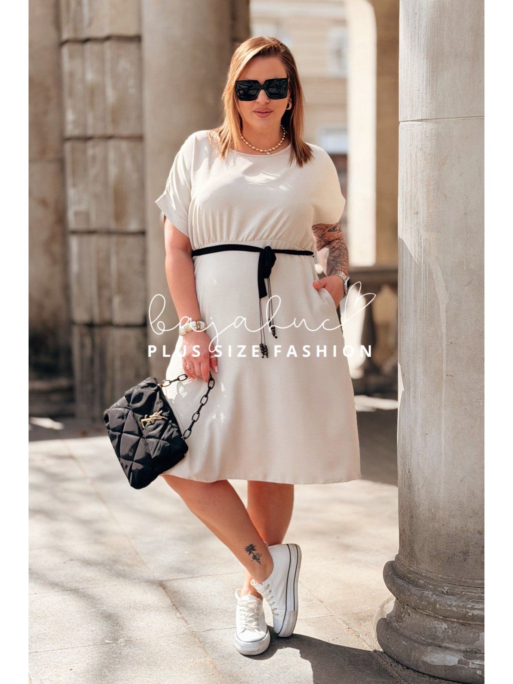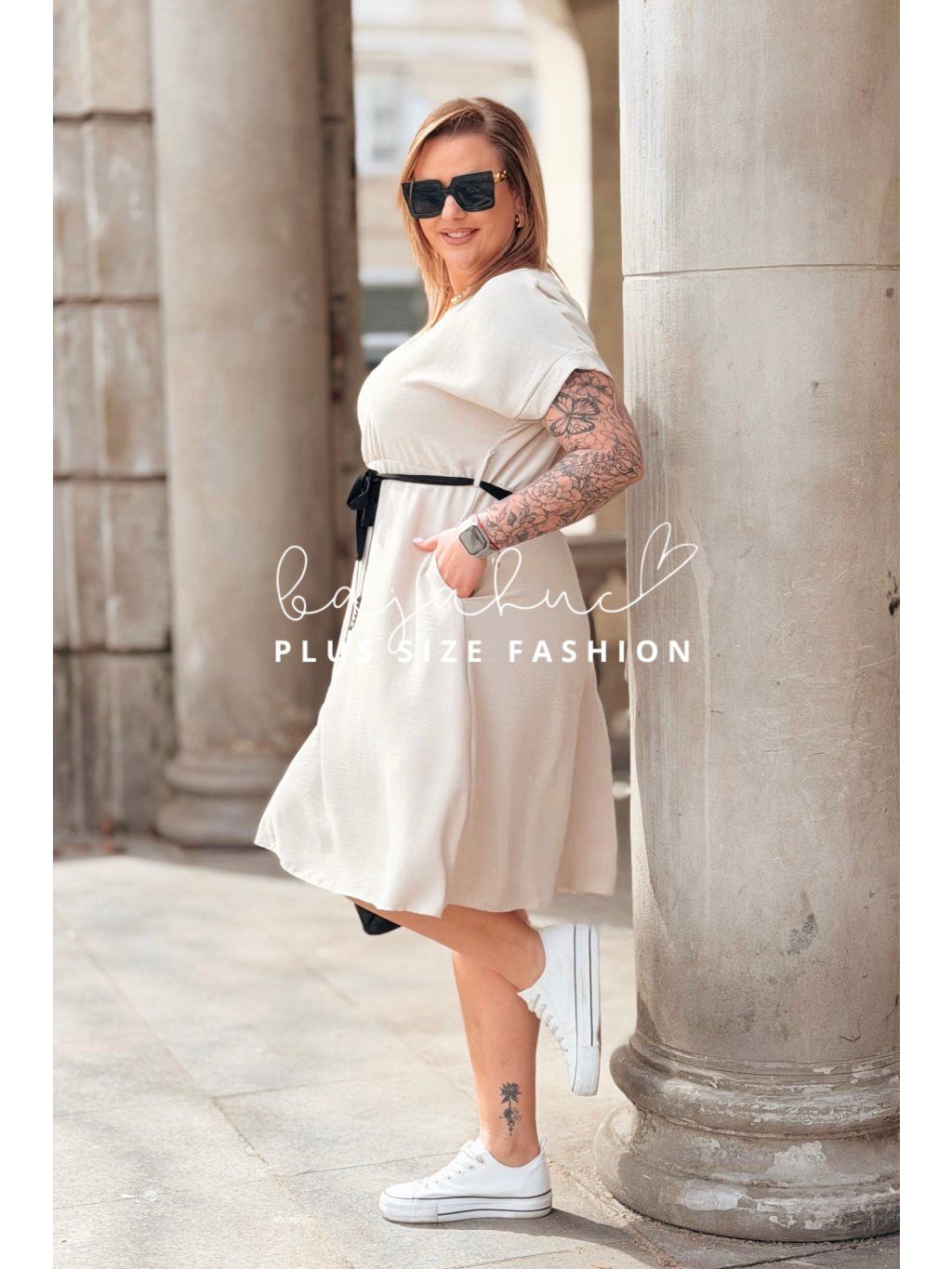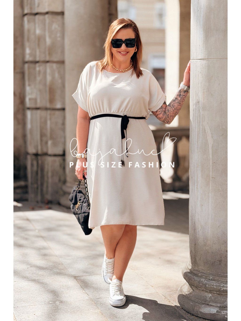 Krátke plus size šaty LUANITA sú navrhnuté pre ženy, ktoré chcú vyzerať oslnivo počas celého dňa a zároveň majú radi pohodlie a voľnosť. Ide o model pohodlného strihu s praktickými vreckami po bokoch. Šaty majú okrúhly výstrih a krátke rukávy. Vďaka svojmu strihu zakryjú nedokonalosti postavy, budete sa v nich cítiť sviežo a príjemne. Opasok model oživuje a pomáha zvýrazniť pás. Je to model, ktorý skvelo sadne na postavu, vďaka čomu sa každá žena bude cítiť žensky a štýlovo počas celého dňa.