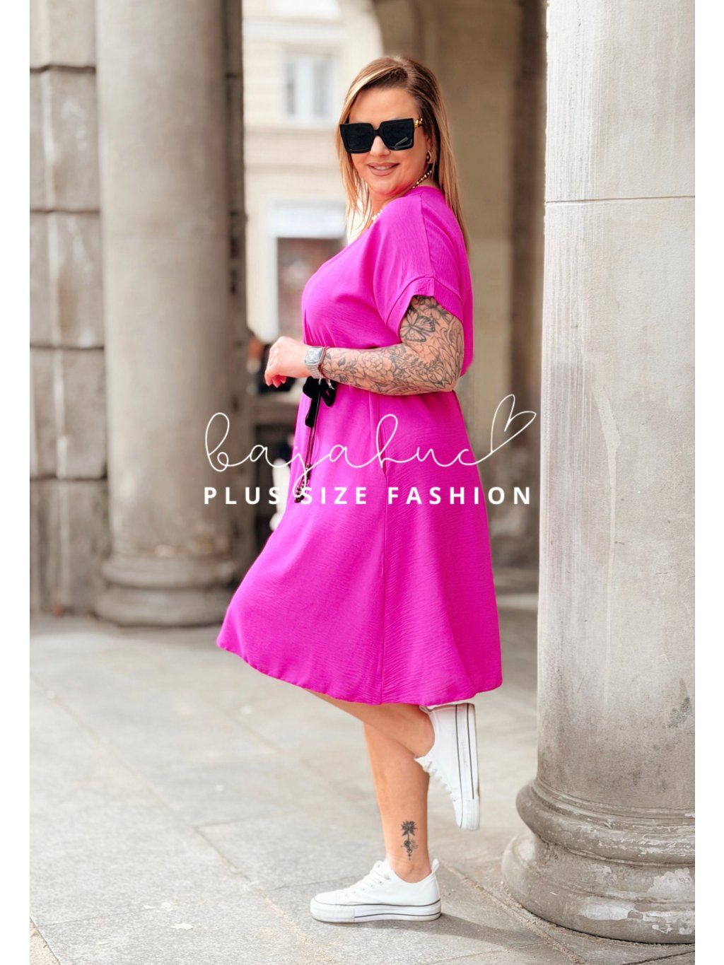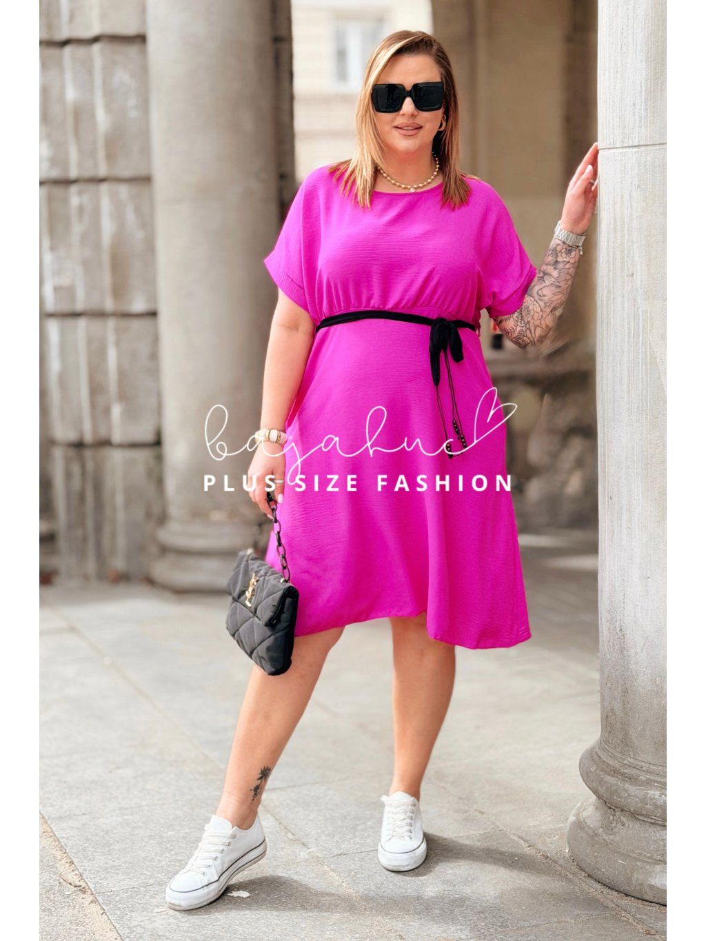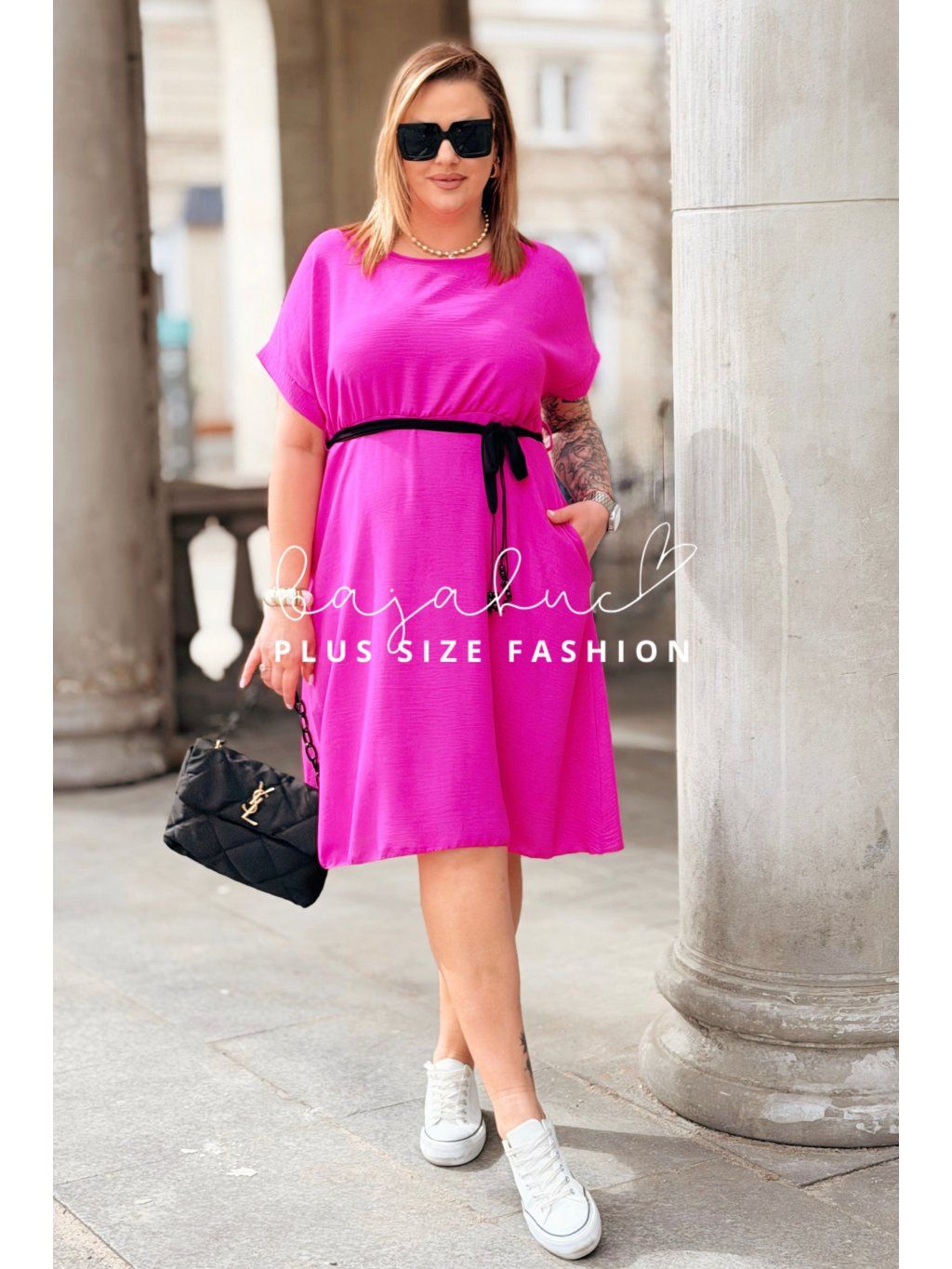 Krátke plus size šaty LUANITA sú navrhnuté pre ženy, ktoré chcú vyzerať oslnivo počas celého dňa a zároveň majú radi pohodlie a voľnosť. Ide o model pohodlného strihu s praktickými vreckami po bokoch. Šaty majú okrúhly výstrih a krátke rukávy. Vďaka svojmu strihu zakryjú nedokonalosti postavy, budete sa v nich cítiť sviežo a príjemne. Opasok model oživuje a pomáha zvýrazniť pás. Je to model, ktorý skvelo sadne na postavu, vďaka čomu sa každá žena bude cítiť žensky a štýlovo počas celého dňa.