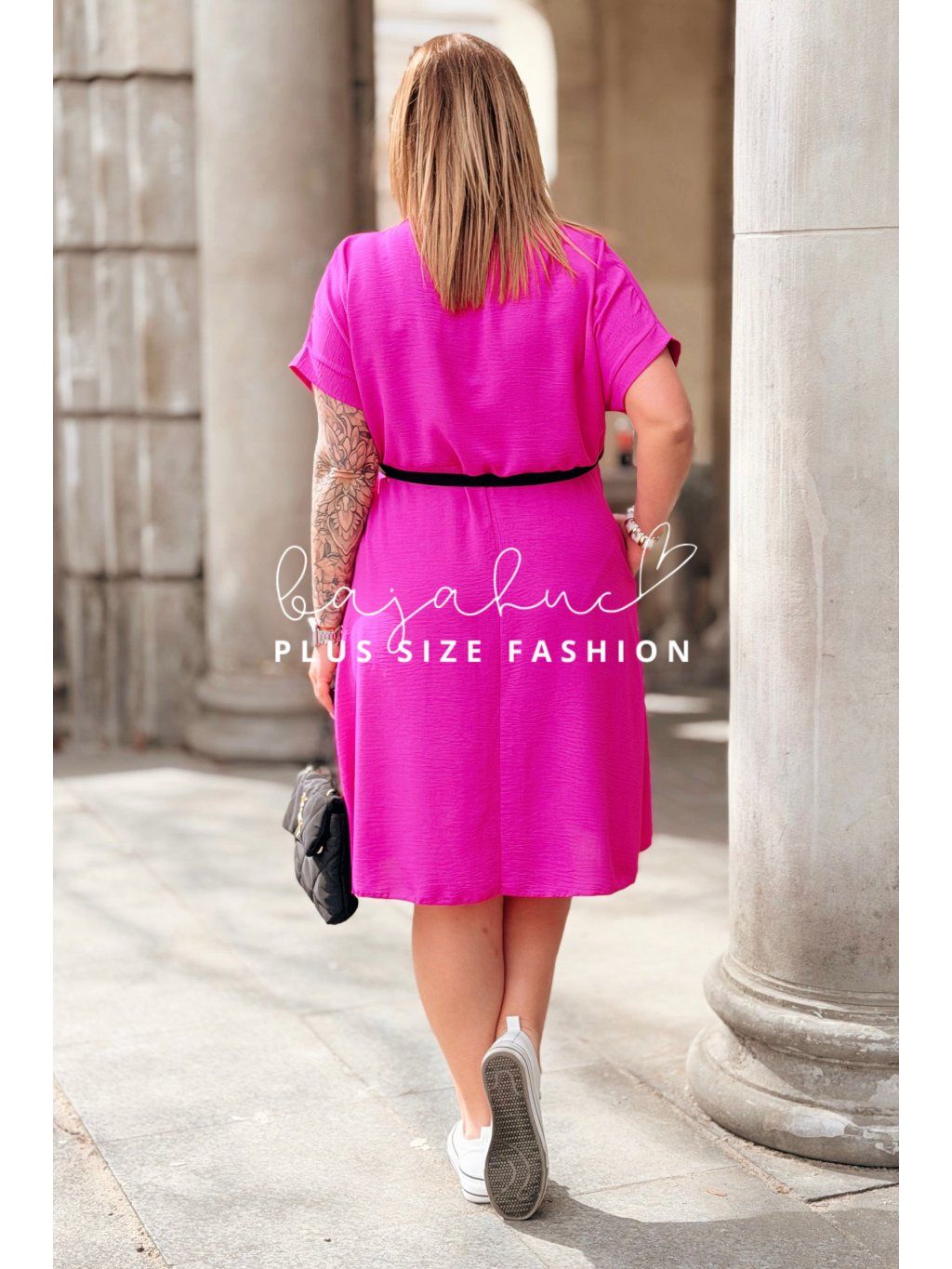 Jednoduché krátke dámske šaty s opaskom pre moletky Luanita fuchsiové