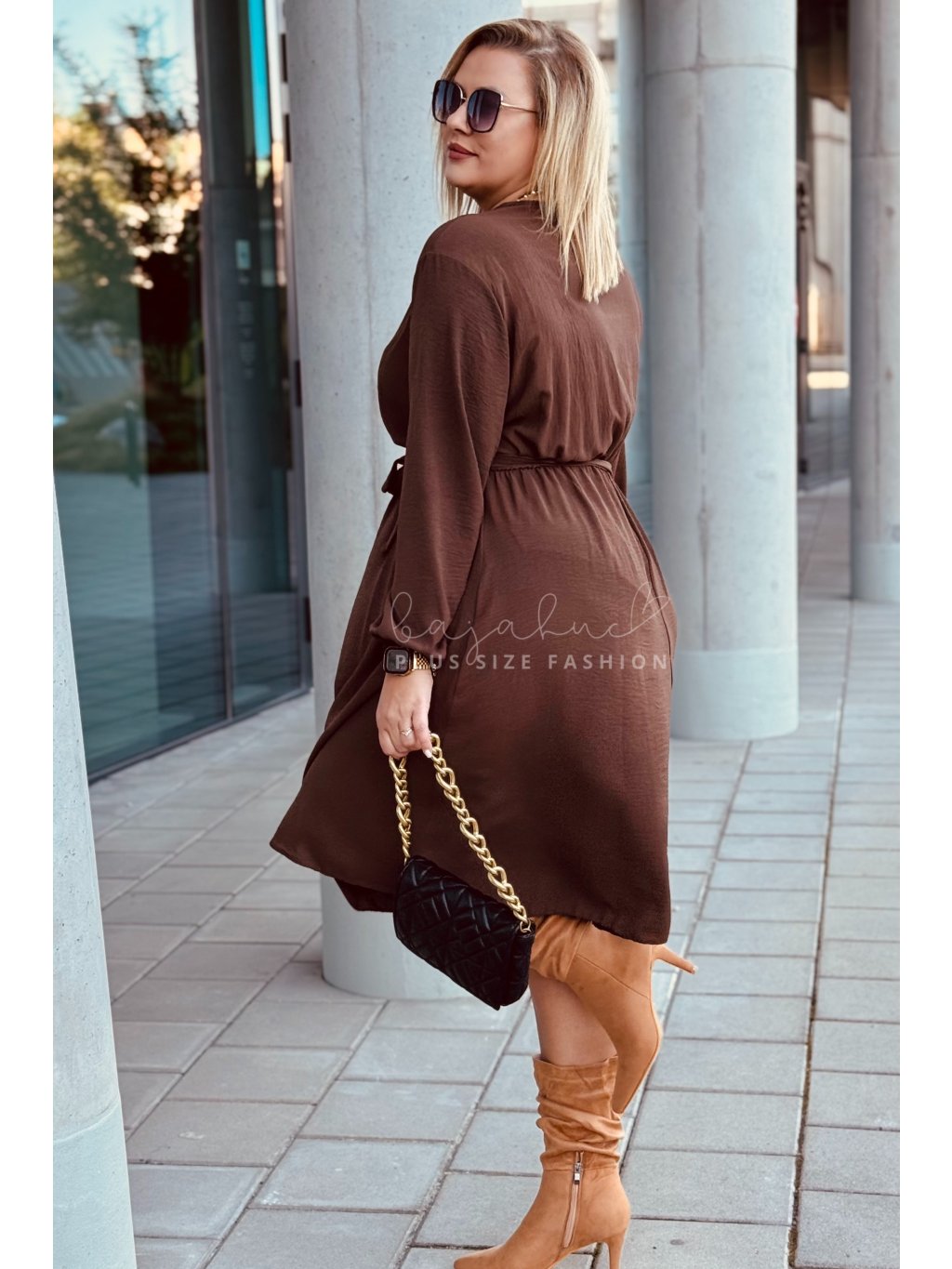 Jednoduché krátke dámske šaty s opaskom pre moletky Marita hnedé