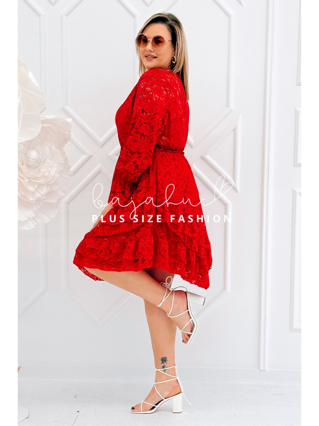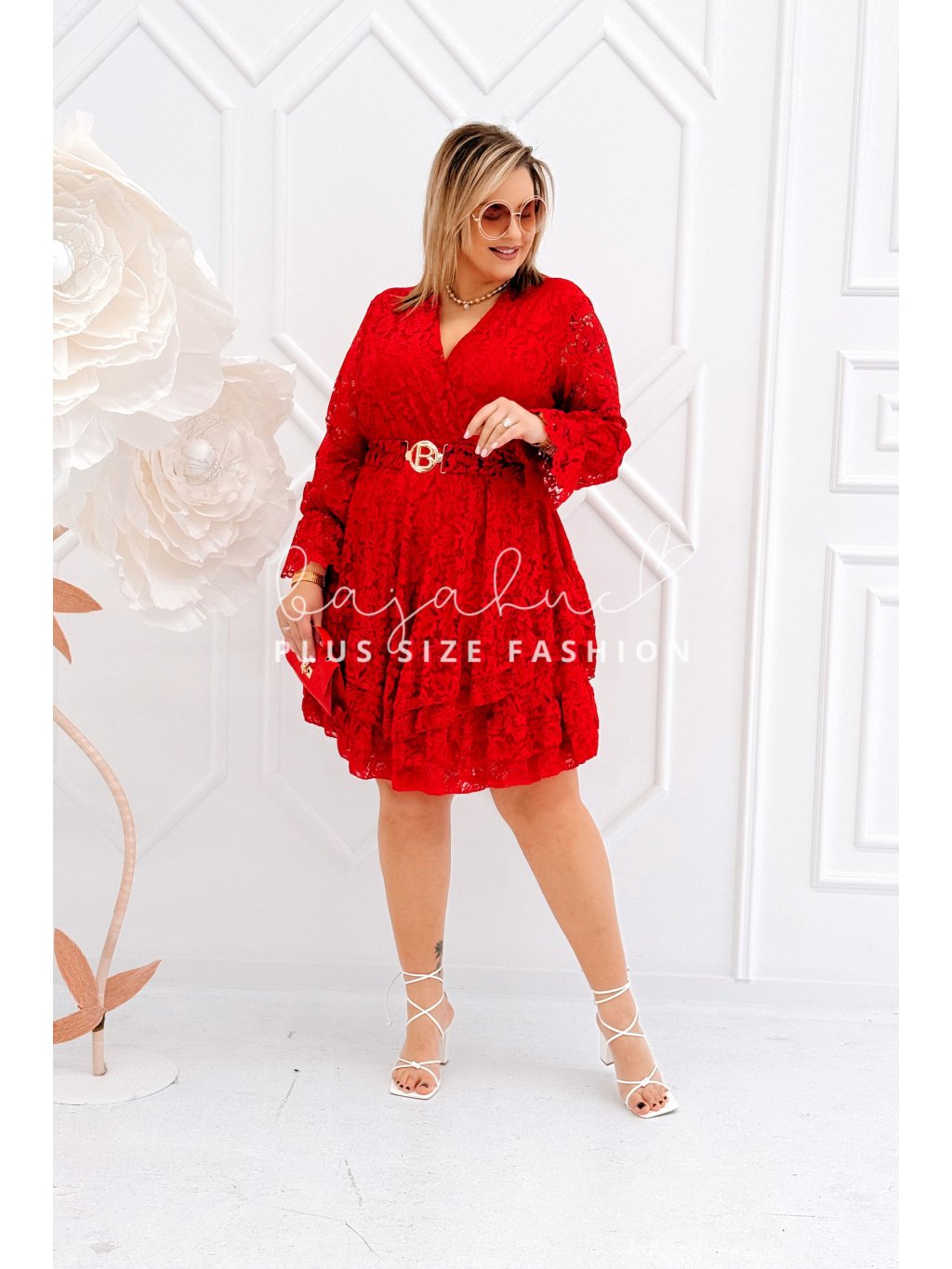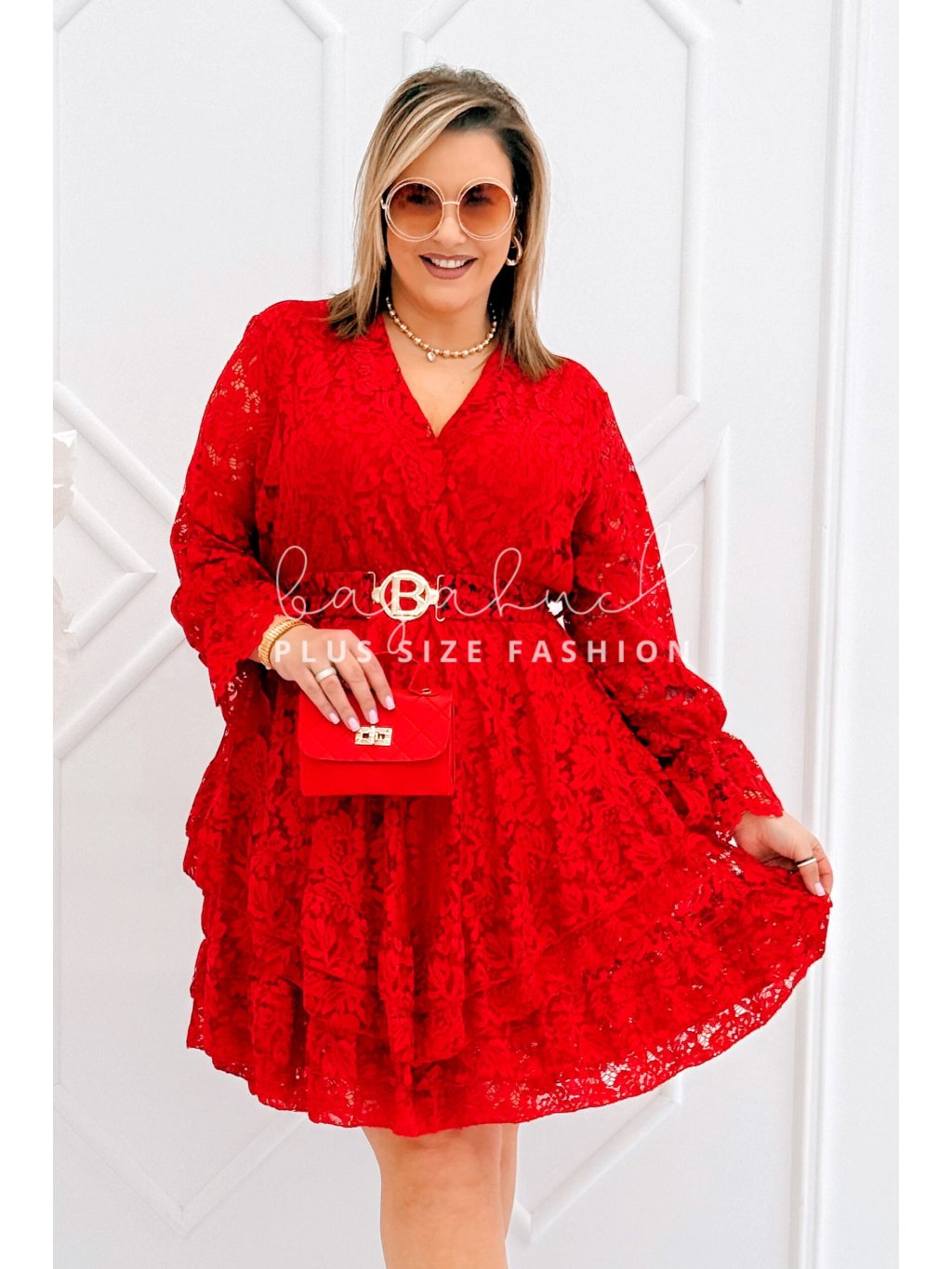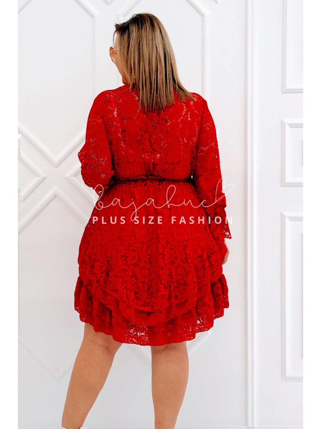 Krátke dámske čipkované šaty s opaskom pre moletky Coria červené