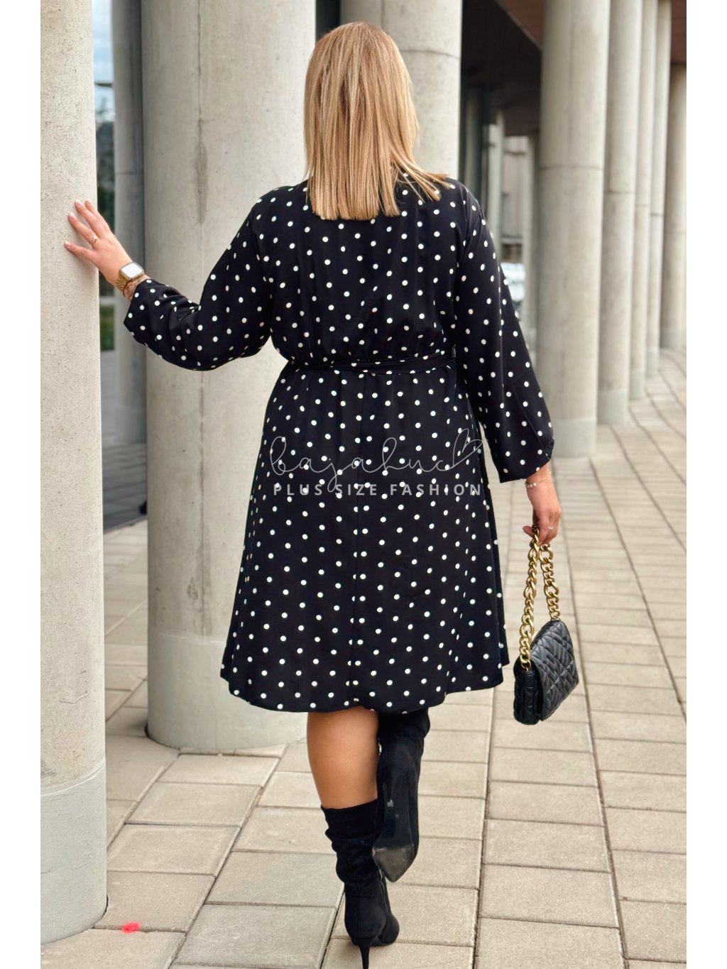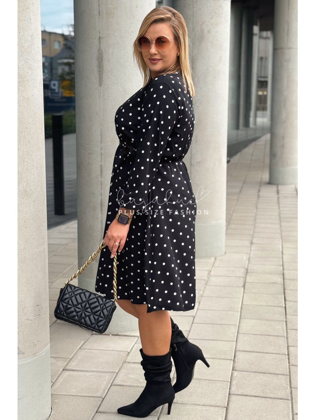 Krátke dámske šaty s rozšírenou sukňou pre moletky Marta čierne s bielymi guličkami