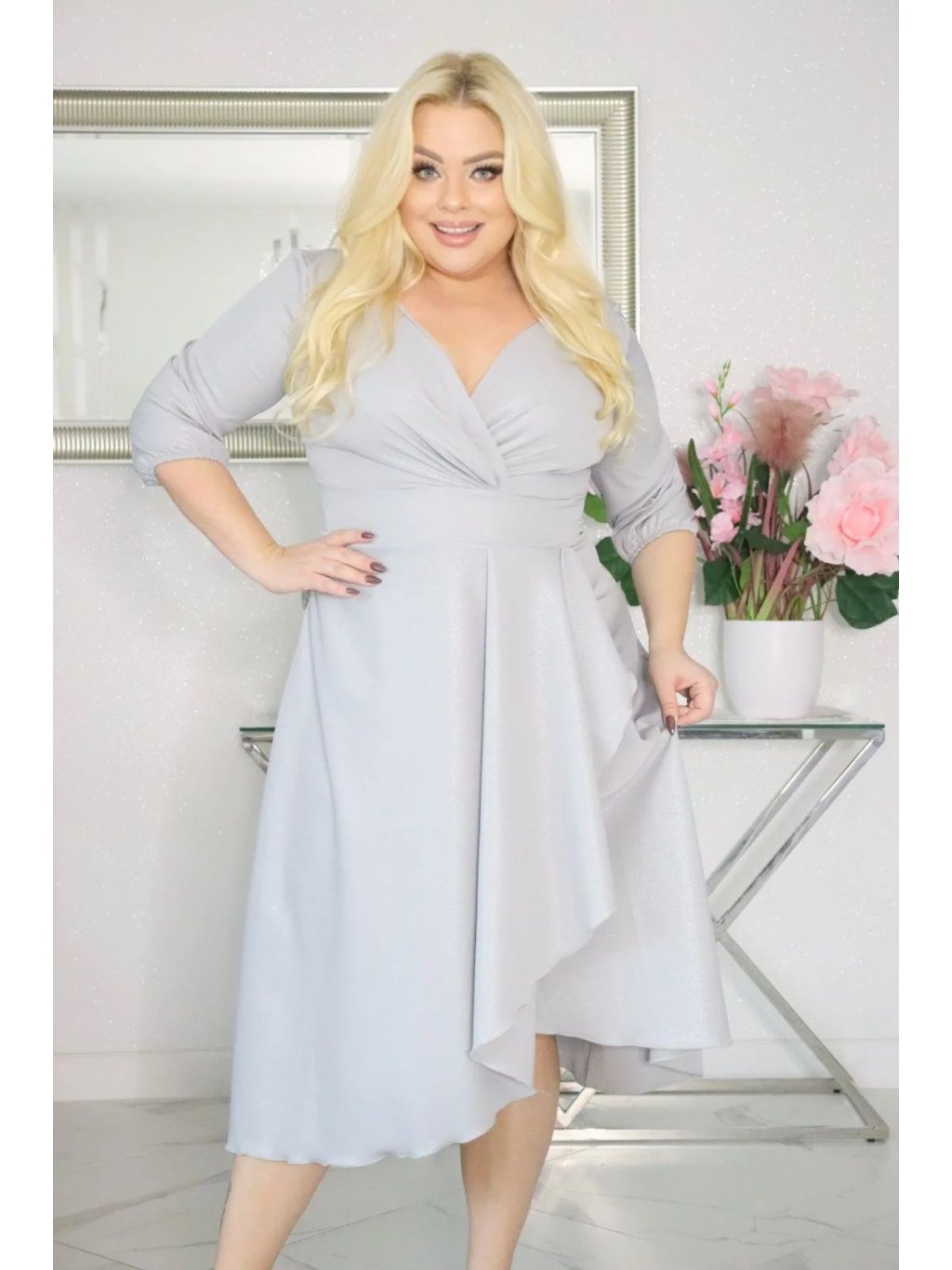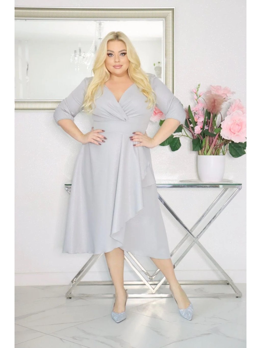 Plus size šaty TIMERA vďaka zaujímavému strihu v kombinácii s trblietavou látkou zaručia že budete vyzerať šik a elegantne. Aby ste tento efekt ešte umocnili, zlaďte ich s vysokými podpätkami, alebo ľahkými sandálmi s vysokými podpätkami, ako aj s malou elegantnou kabelkou.