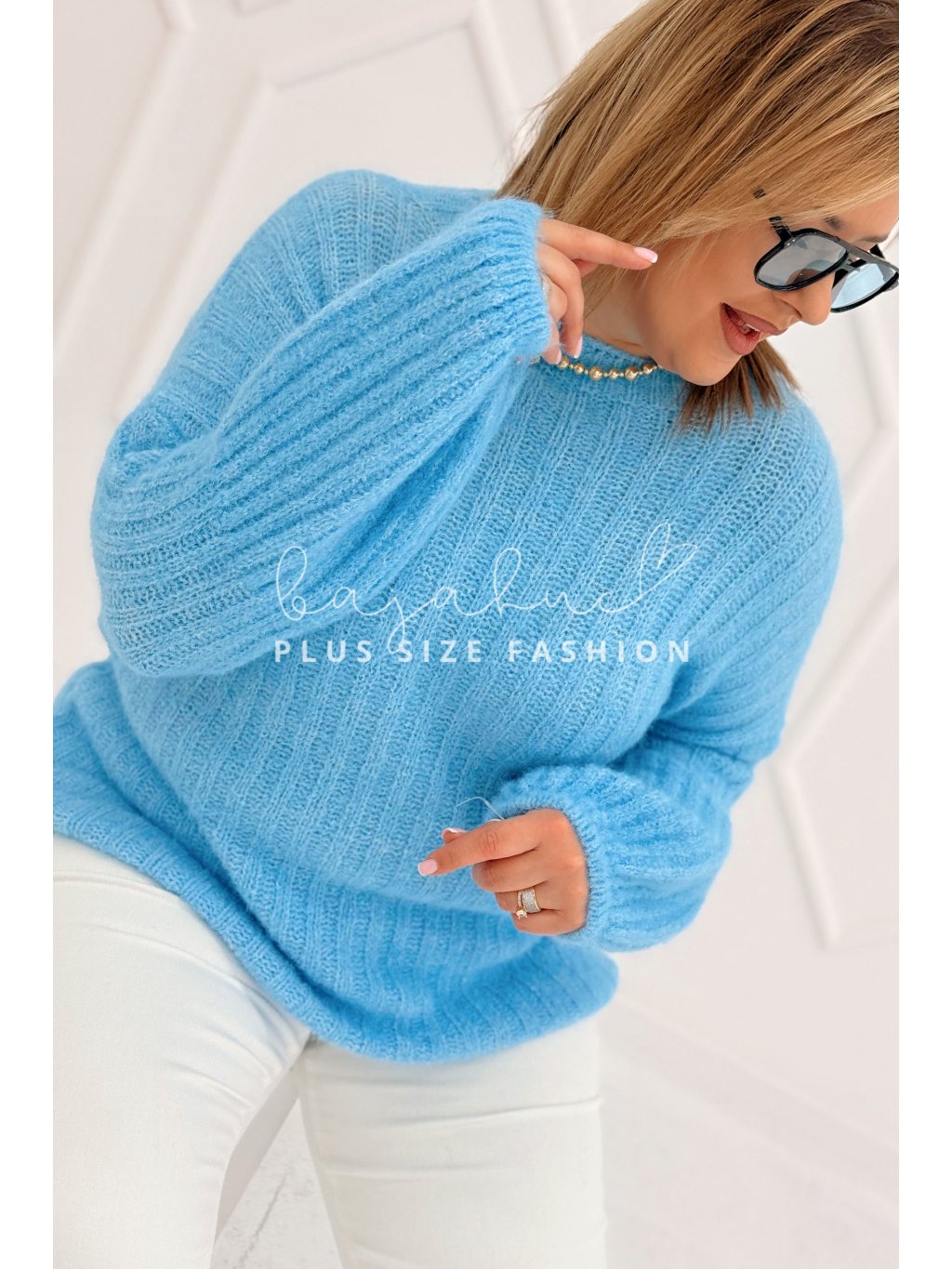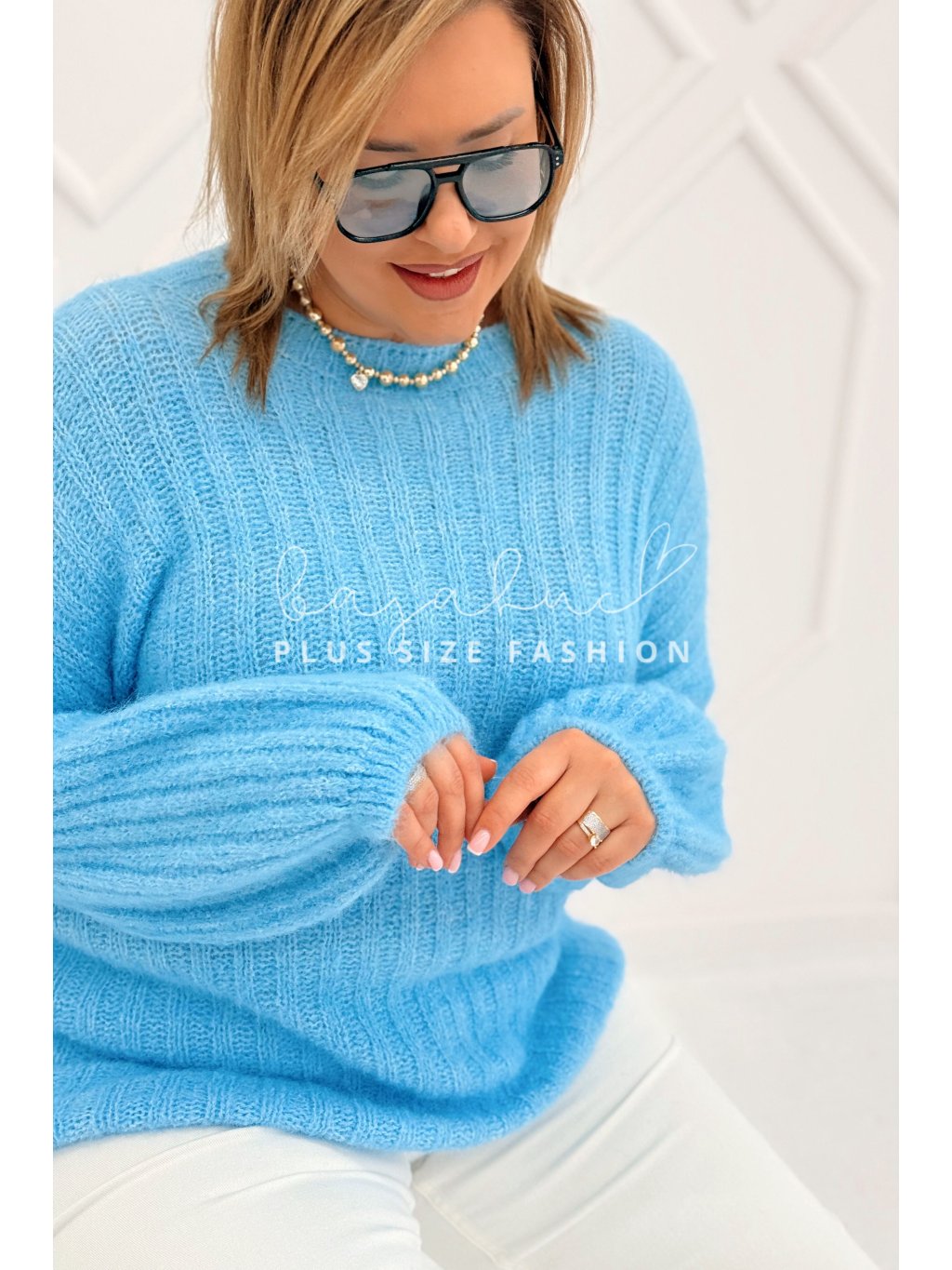 Pohodlný dámsky sveter s balónovými rukávmi pre moletky Elinet modrý