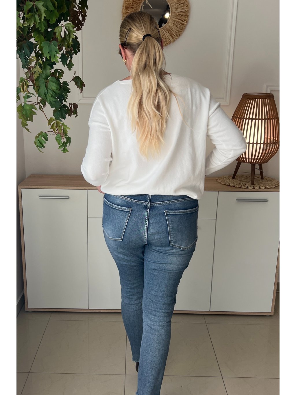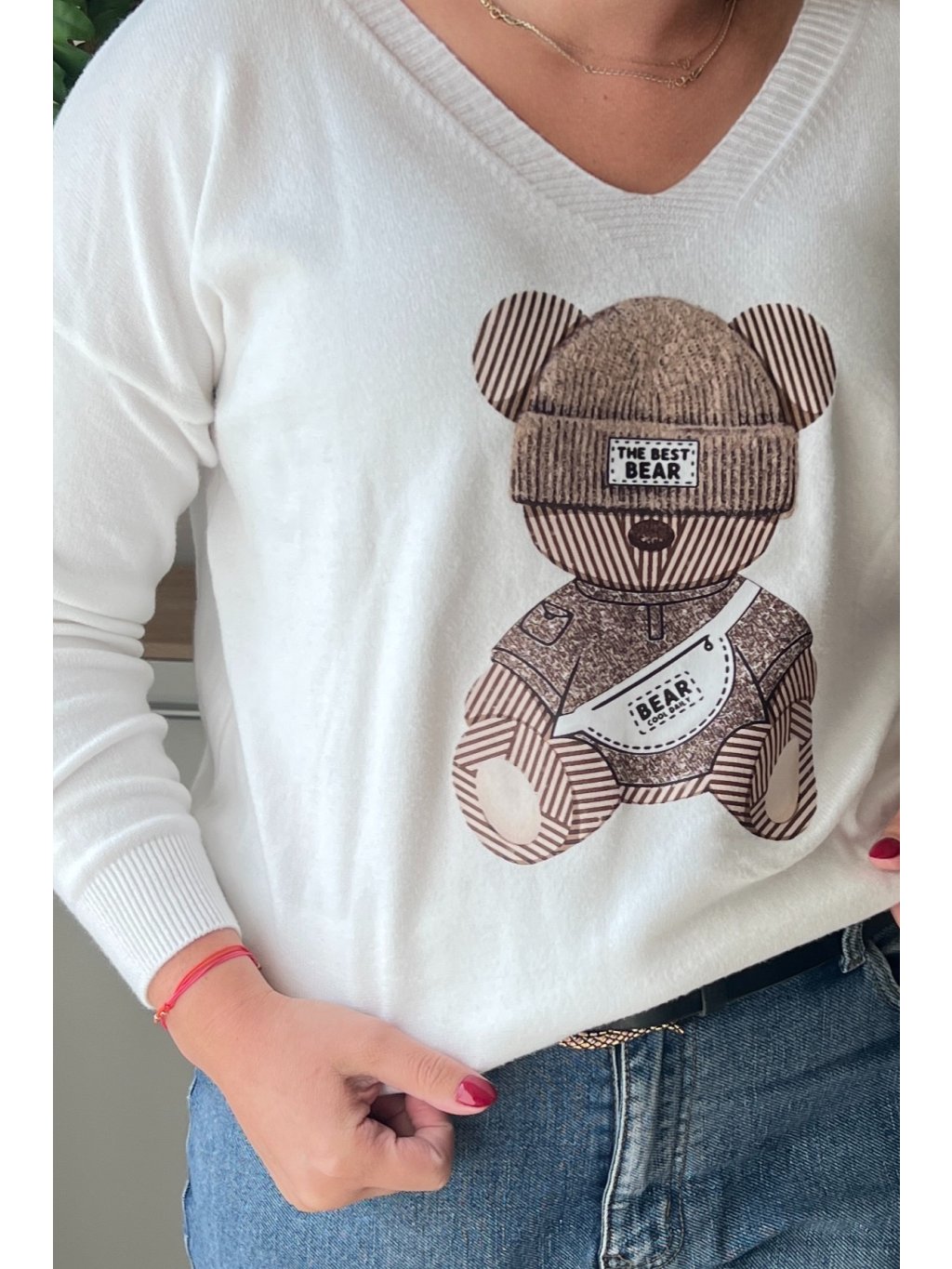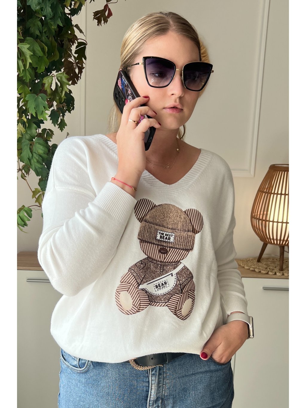 Pohodlný plus size sveter s aplikáciou macka Janet biely