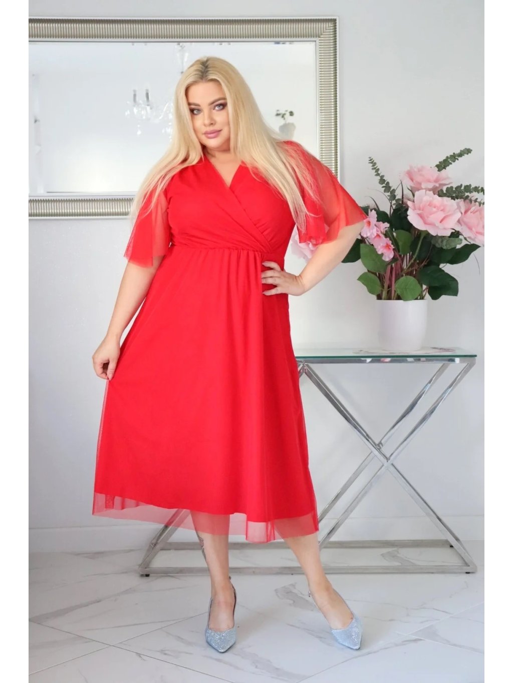 Vzdušné dámske midi šaty s tylom pre moletky Lydia červené