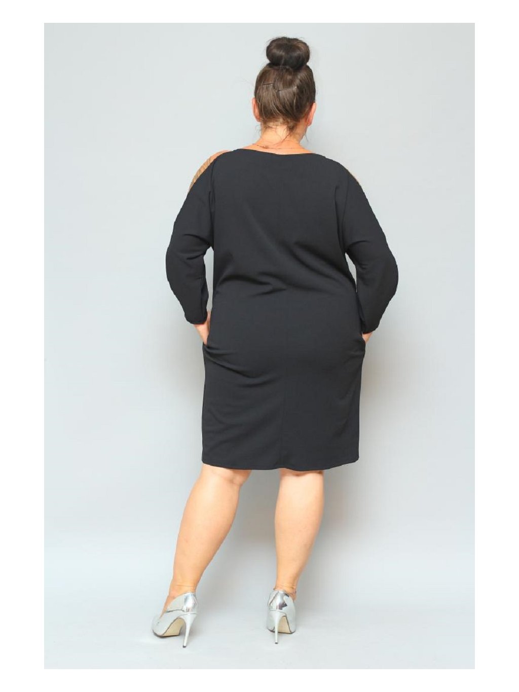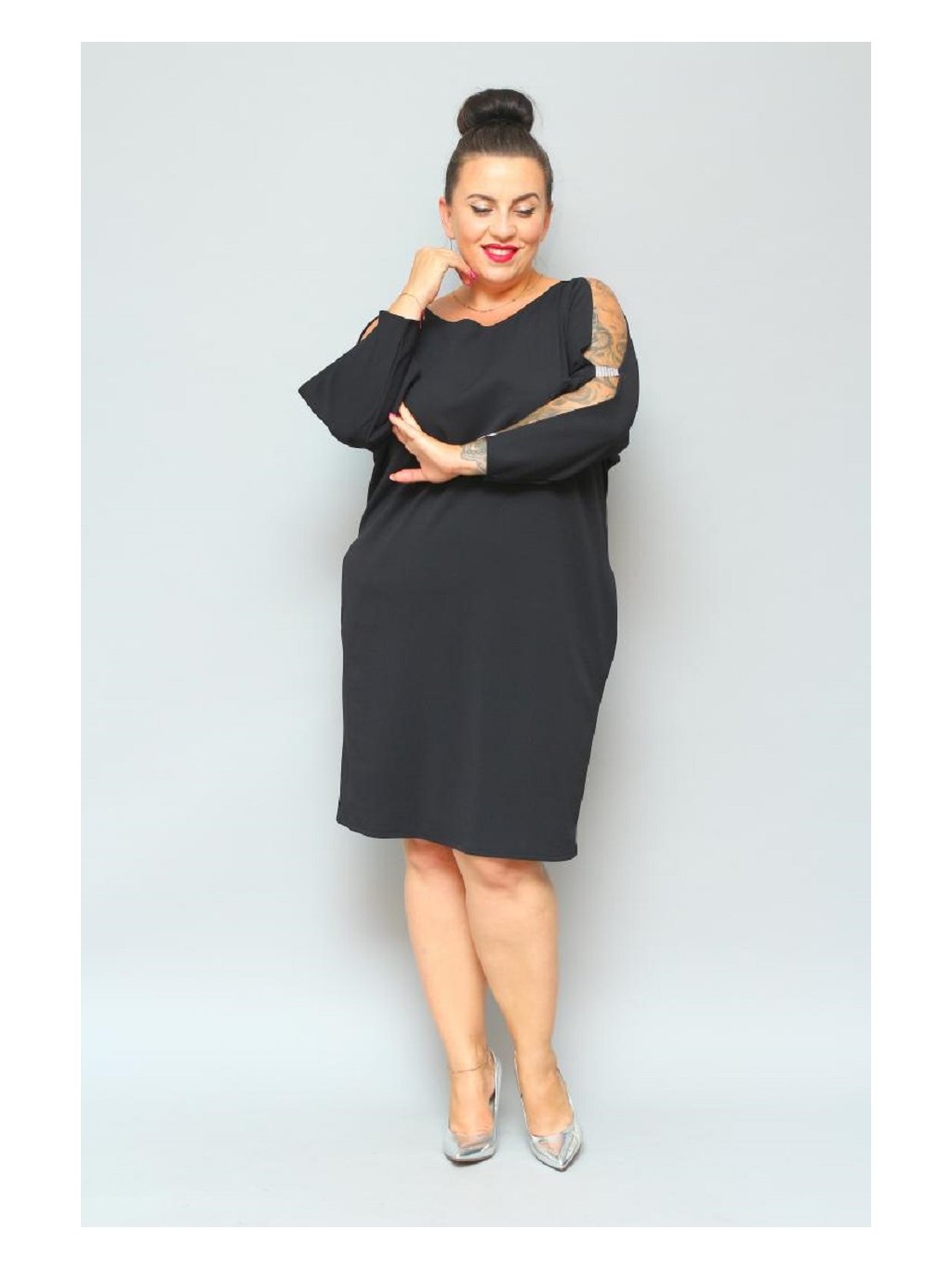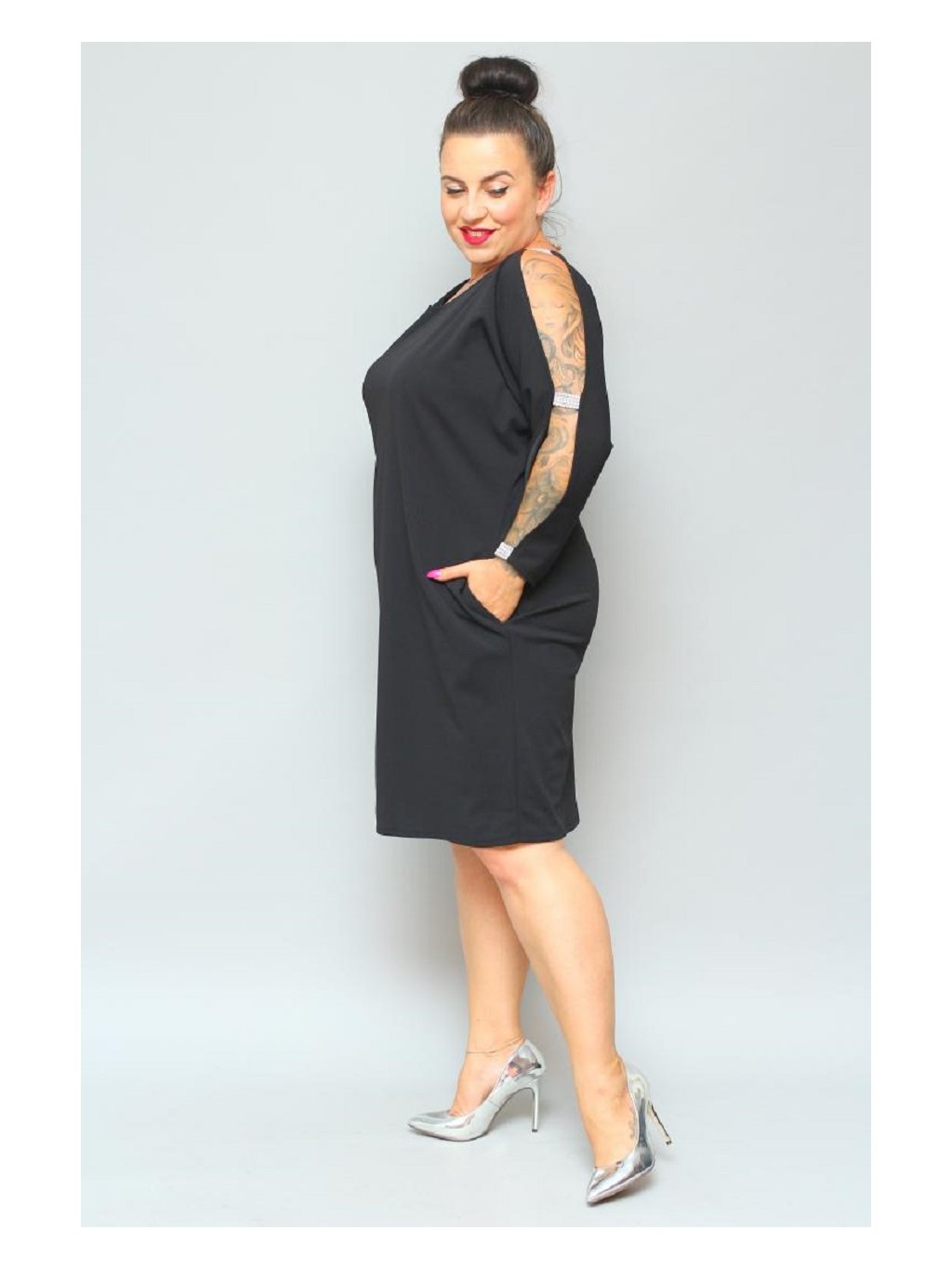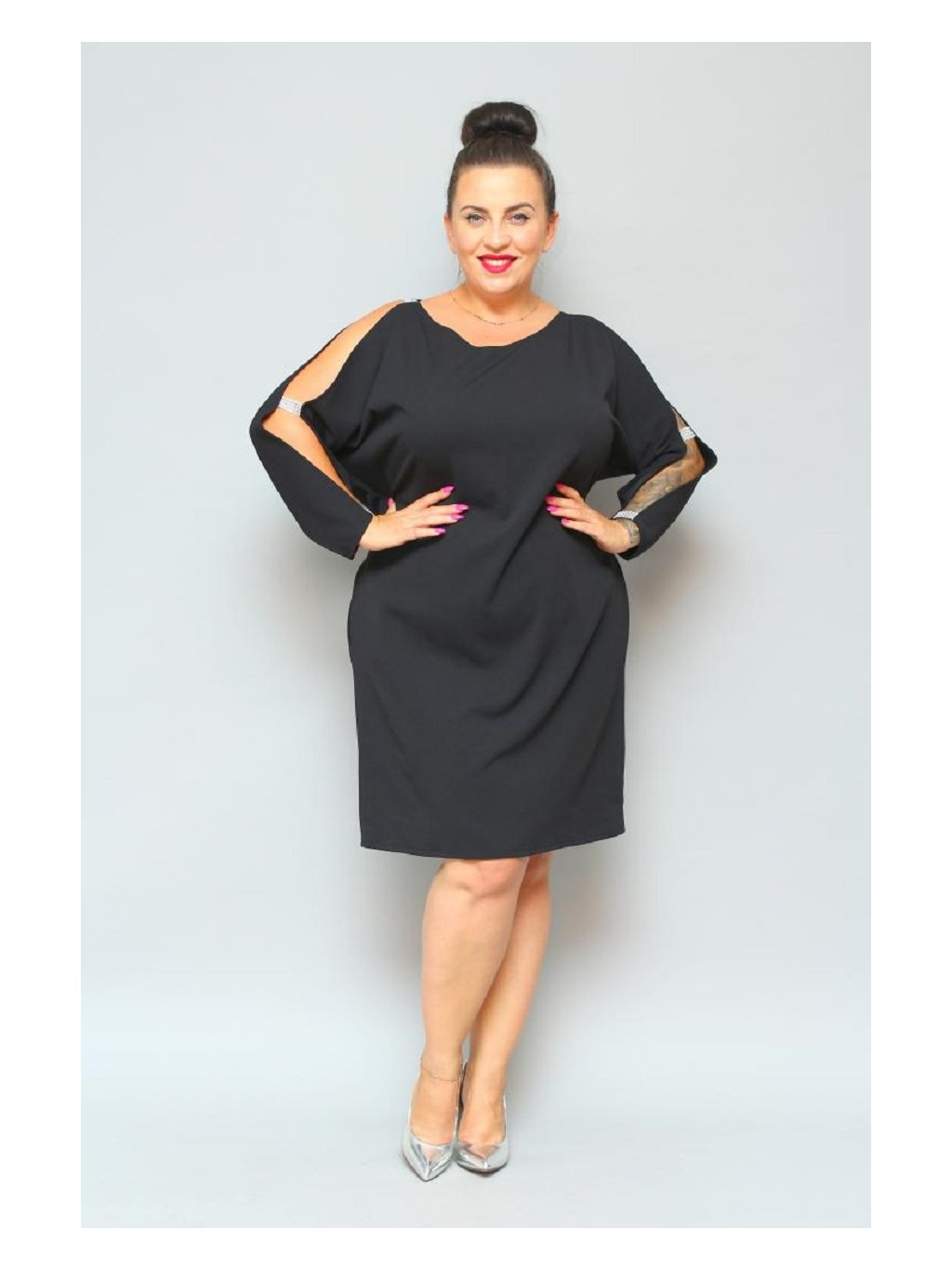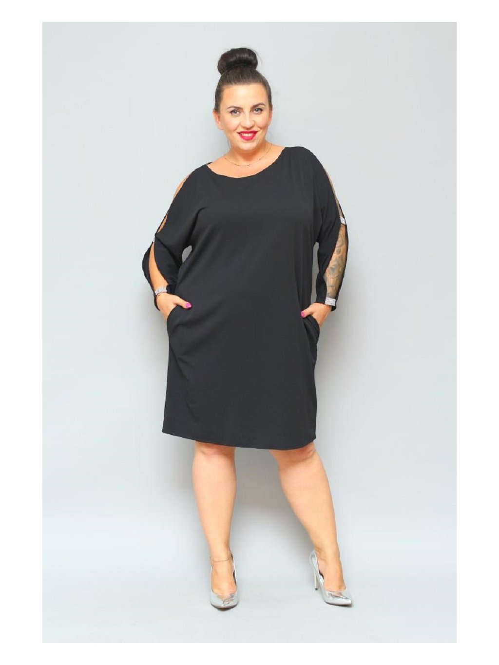 NA SKLADE Krátke spoločenské oversize šaty pre moletky s kryštálikmi na rukávoch Christin čierne hladké