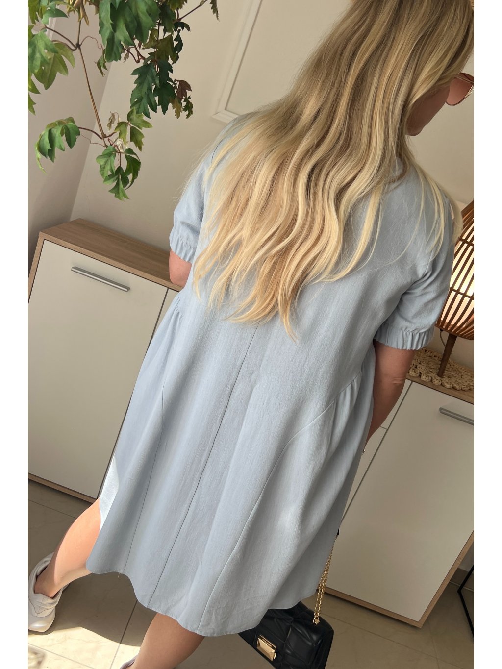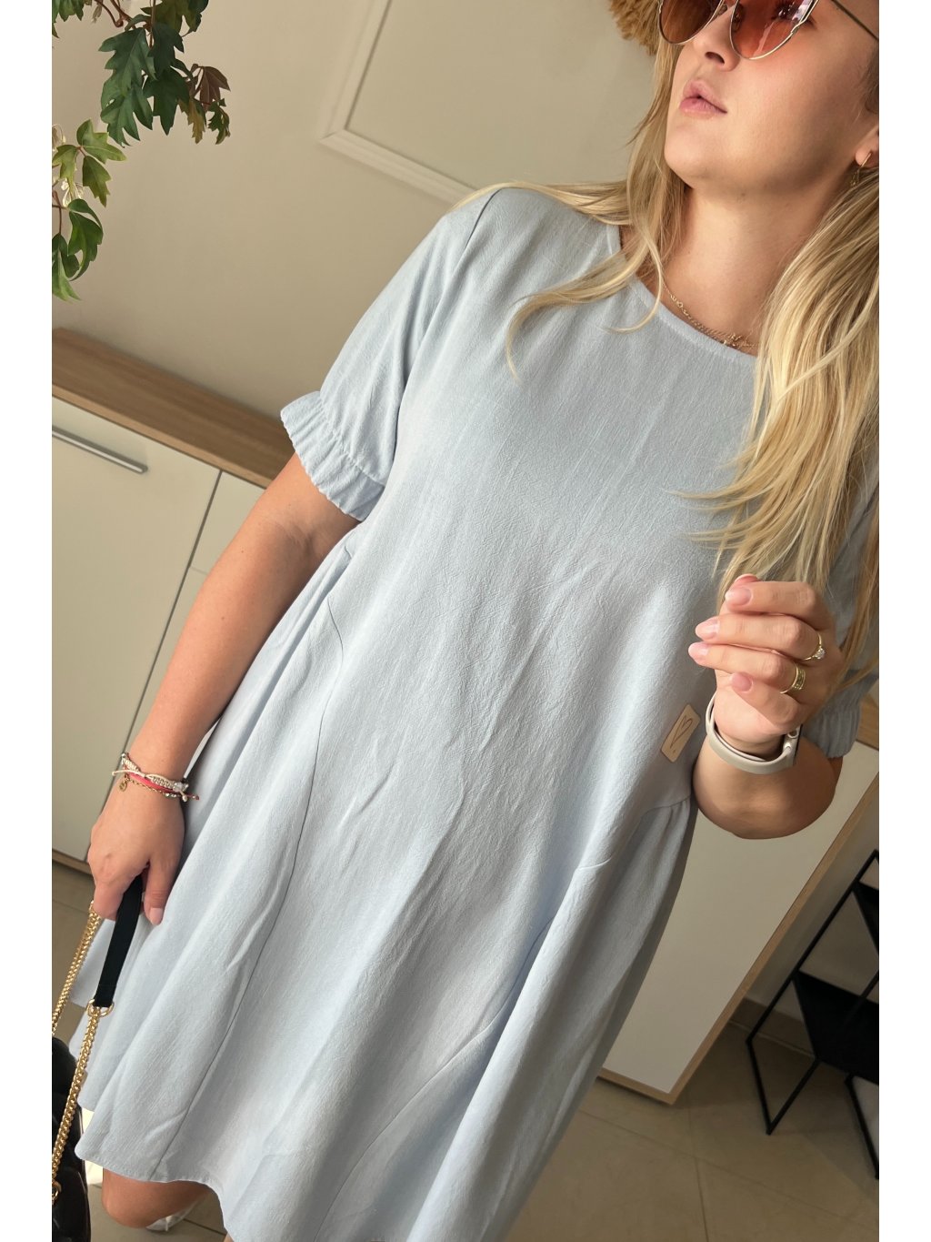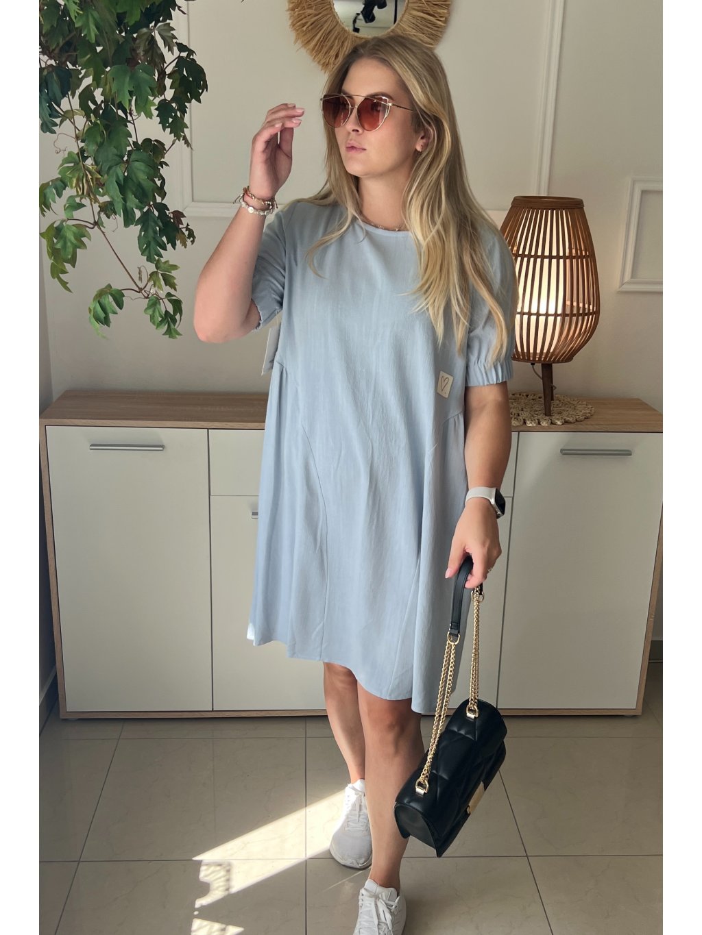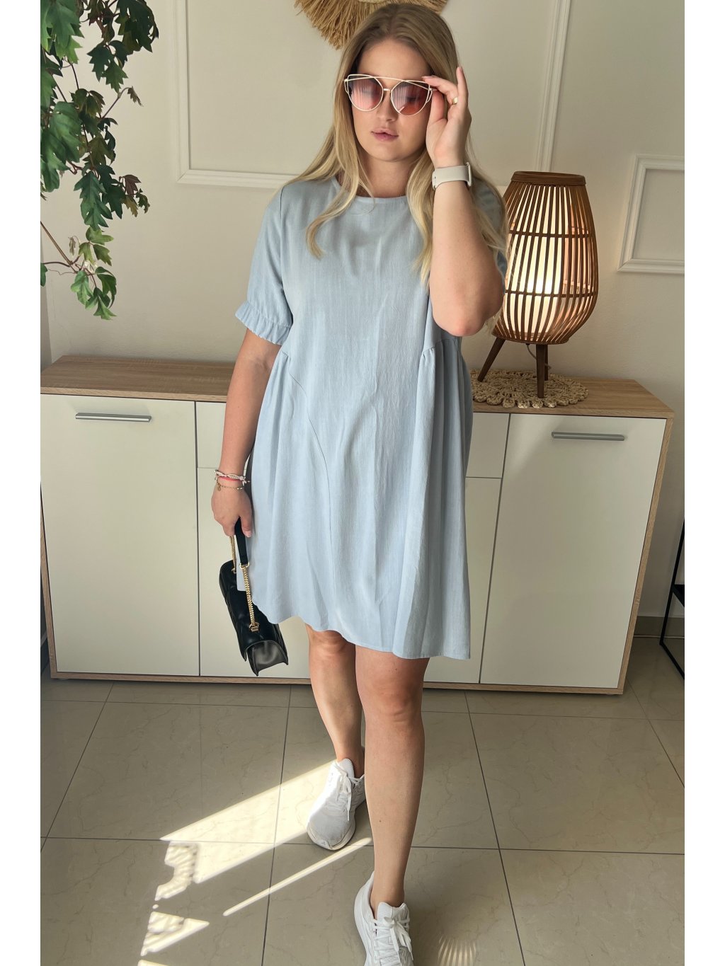 Pohodlné dámske ľanové plus size šaty DAKOTA sú vynikajúcim modelom pre ženy, ktoré oceňujú jednoduchosť a pohodlie. Šaty majú krátky rukáv ukončený gumou a klasický okrúhly výstrih. Jednoduchý štýl je oživený jemným riasením na bokoch sukne a malou nášivkou. Lichobežníkový strih šiat je vhodný pre akýkoľvek typ postavy. Takýto strih skryje všetky nedostatky a zvýrazní prednosti postavy. Tento model si určite nájde mnoho priaznivcov medzi moletkami, ktoré ocenia voľnosť, pohodlie a predovšetkým ženskosť.