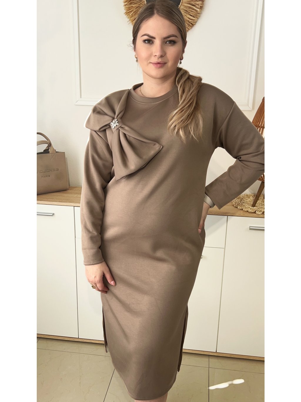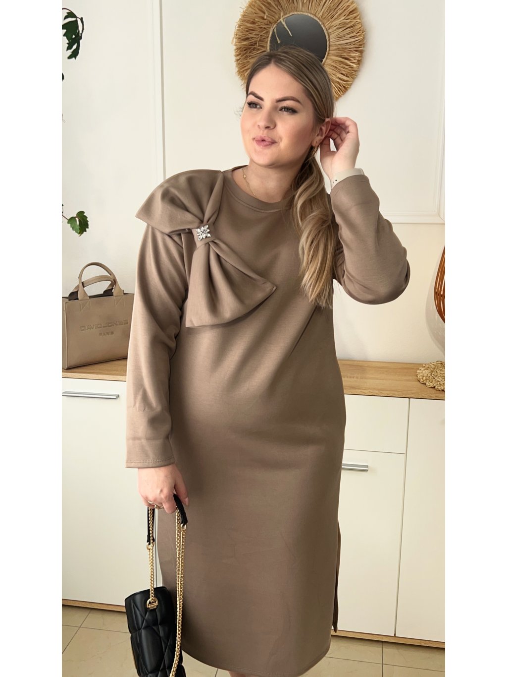 Jednoduché plus size šaty HANDE sú vyrobené z kvalitnej a príjemnej látky. Ide o model rovného strihu, s rozparkami po bokoch a praktickými vreckami. Šaty pre moletky HANDE sú v midi dĺžke, a sú ideálne pre ženy s krivkami, ktoré majú radi pohodlie a štýl. Zdanlivo jednoduchý model je oživený veľkou mašľou s brošňou, ktorá celku dodáva nádych elegancie. Šaty majú jednoduchý oblúkový výstrih a dlhé rukávy. Všestranný model, ktorý môžete využiť na mnoho príležitostí.